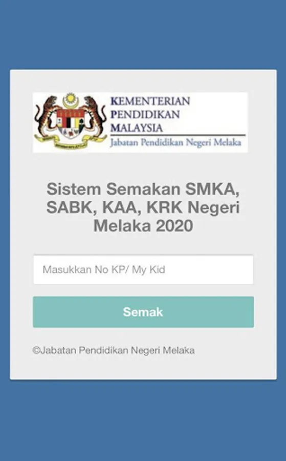 Sistem ini direka bagi memudahkan semakan kemasukan pelajar ke Tingkatan 1 bagi Sekolah Menengah Kebangsaan Agama, Kelas Rancangan Agama, Sekolah Agama Bantuan Kerajaan dan Kelas Rancangan Khas di negeri Melaka. Sistem ini dibangunkan oleh Pegawai-Pegawai di Sektor Sumber Teknologi Pendidikan Jabatan Pendidikan Melaka. Diharap sedikit usaha ini dapat memudahkan urusan bagi semua yang terlibat di negeri Melaka. Insha Allah