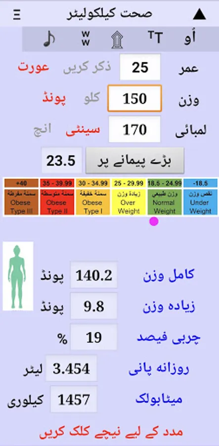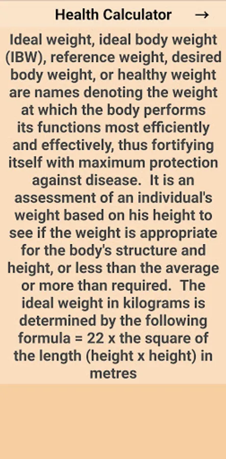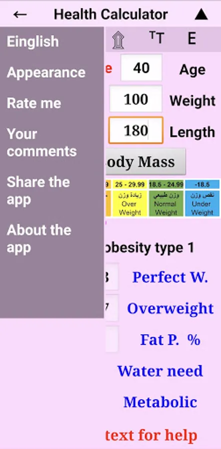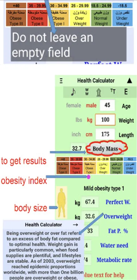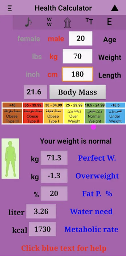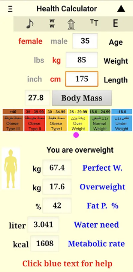 calculate BFP Body Fat Percentage ,IBW Ideal Body Weight ,BMI Body Mass Index and BMR Basal Metabolic Rate .