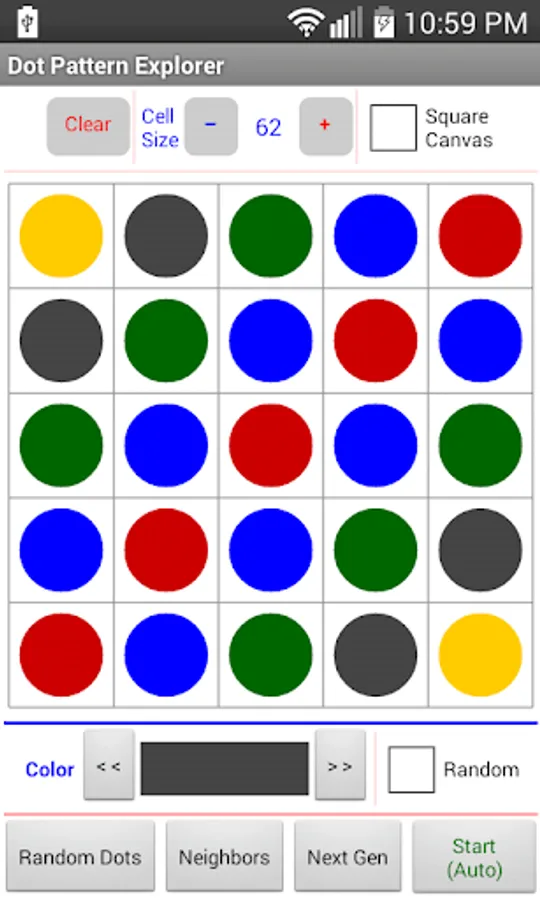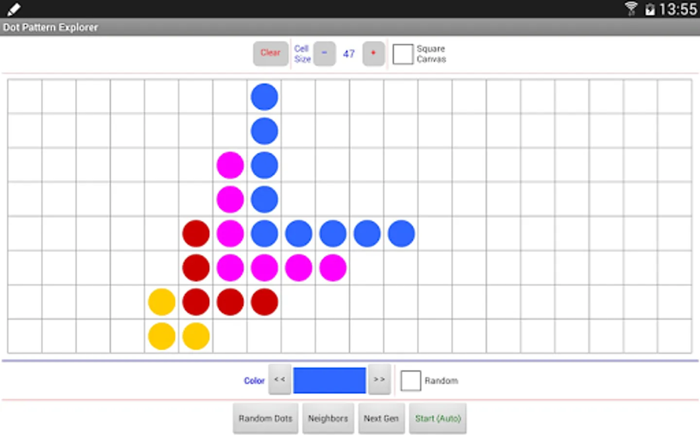 Mathematics is, to a large extent, the study of patterns. Patterns can be visual, numeric, linguistic, rules, formulas, or trends of data. This little app is for teachers and young students in early math. It allows users to create dot patterns to express and communicate their ideas. The Game of Life is also integrated for interested users to get started with cellular automata.
