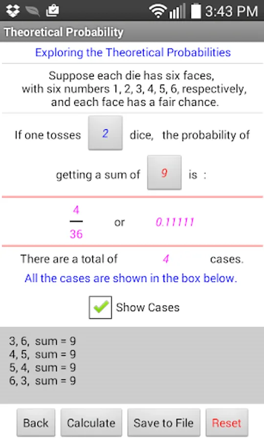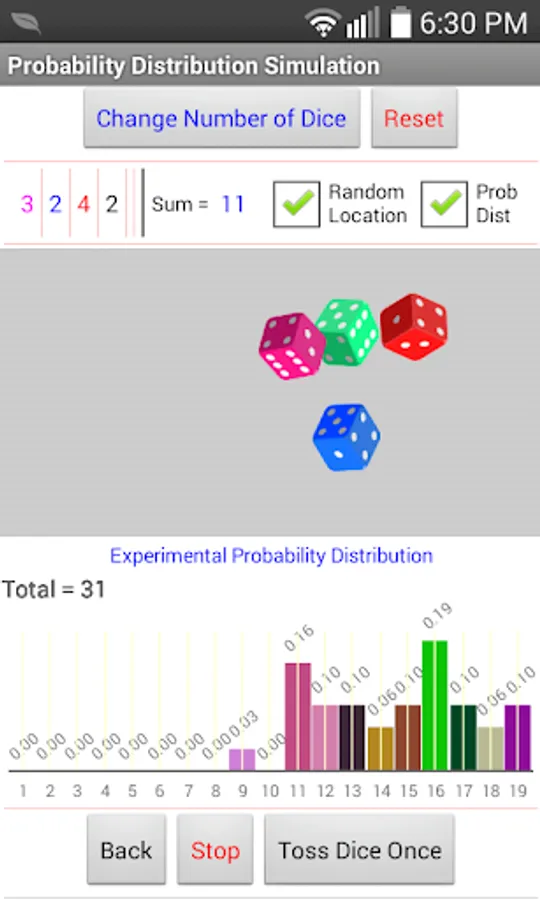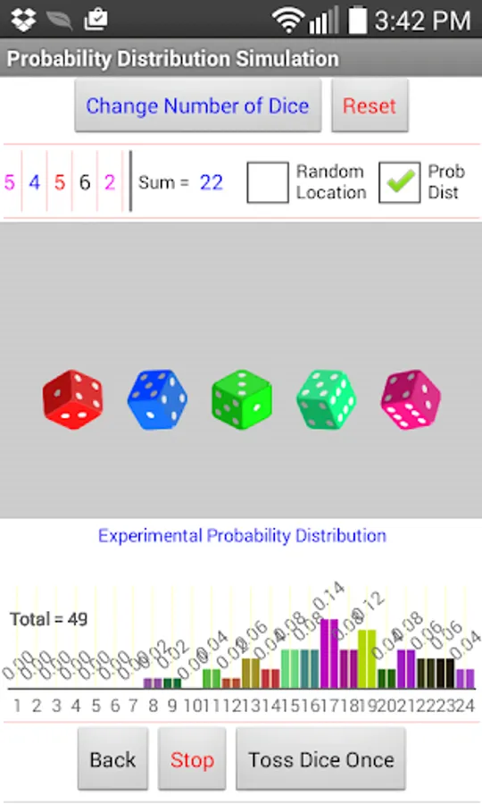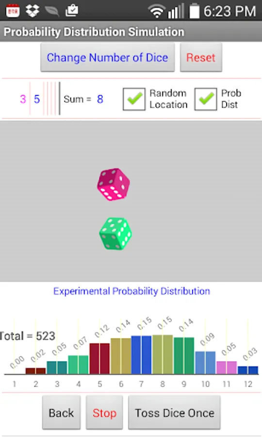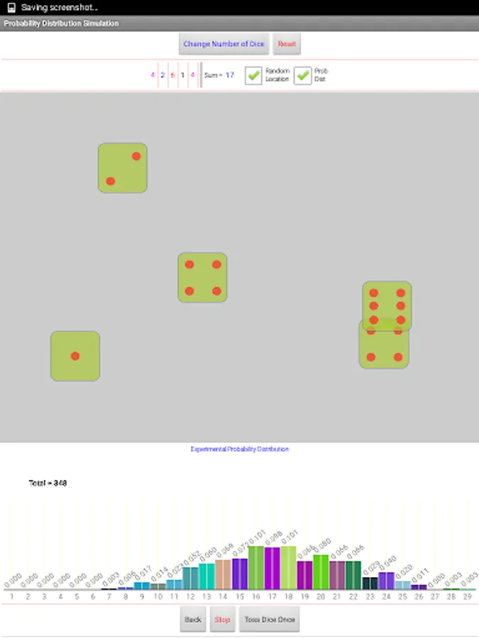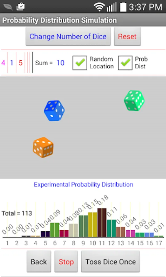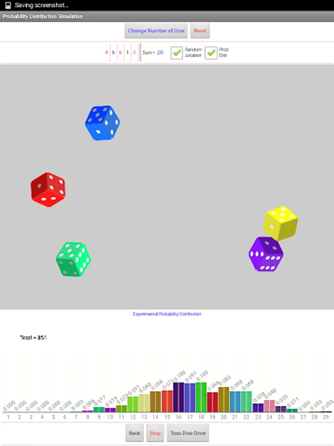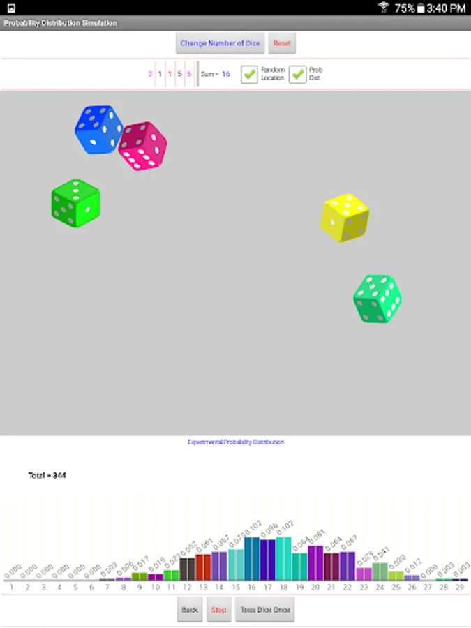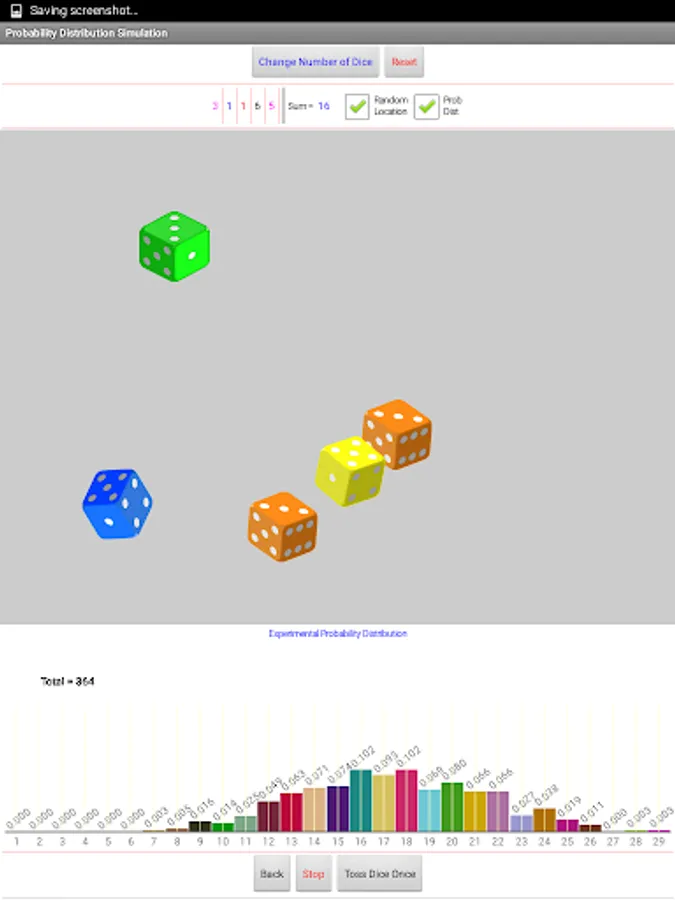 Dice are often used to teach about the ideas of probability and random events. This app has two options that allow users to explore the space of dice-based probabilities. In the probability distribution simulation, one can toss all dice, one at a time or all at a time or continuously, for an experimental probability distribution. With the theoretical probability option, one can specify the number of dice and the sum of interest and enumerate all the different cases for the chosen sum, which leads to a theoretical probability. There are some interesting questions to explore. For example, if one tosses three dice, what is the probability that the sum of them is 12? In simple cases and special sums, one can use a bit of combinatorics. In cases of many dice and an arbitrary sum, a simulation may be more appropriate to get started.
