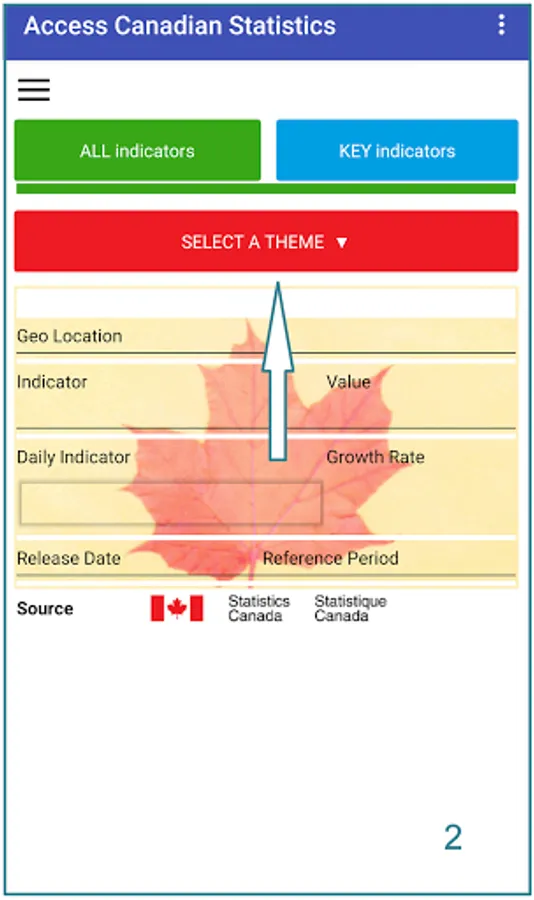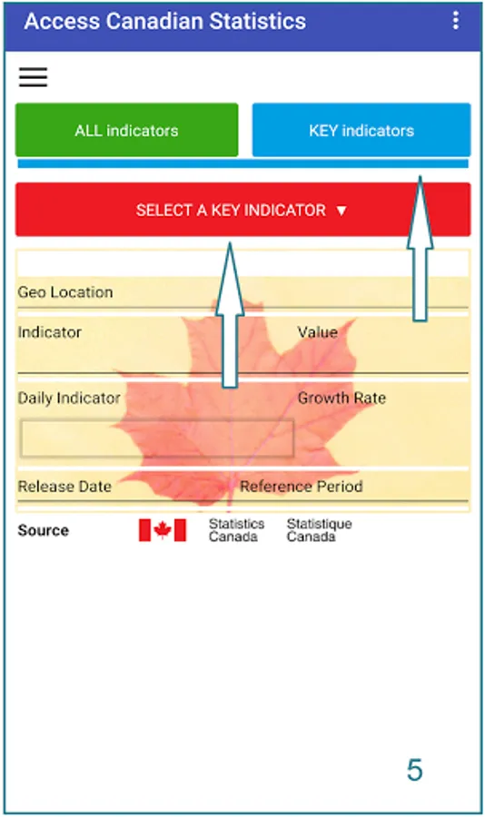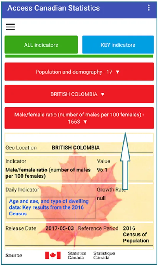Just select a theme and Province/Territory/Canada. Then select any indicator of your choice. You can also access directly the key indicators. The indicators cover a wide range of themes like agriculture, business and consumer services, population and demography and many more.