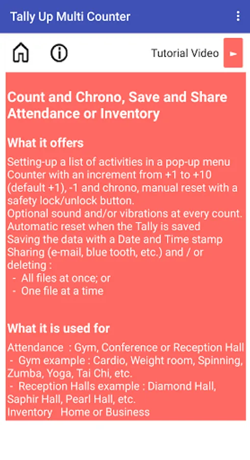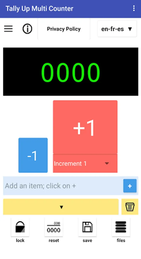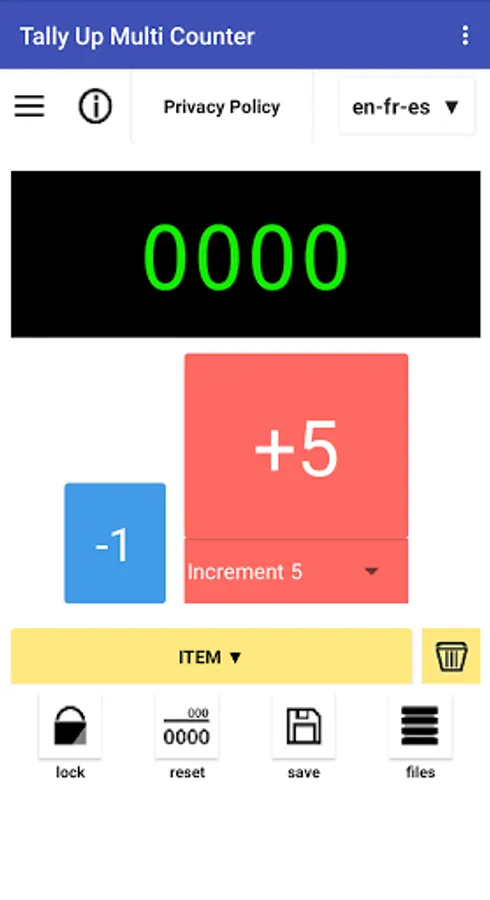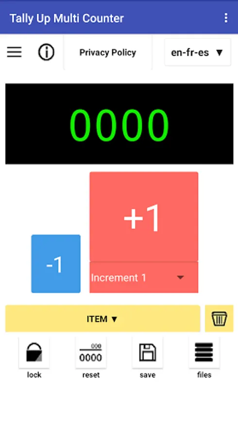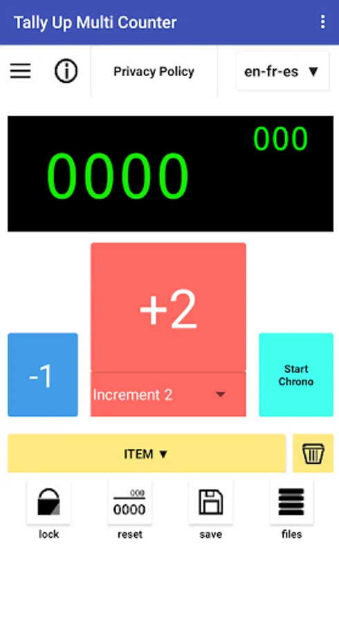 Counter with an increment from +1 to +10 (default +1), -1 and chrono, manual reset with a safety lock/unlock button.