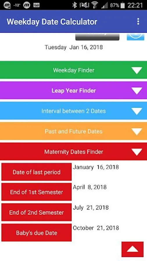 By entering the Date of the last period, you can calculate the dates of the end of the 1st and 2nd semesters and your Baby's due date.