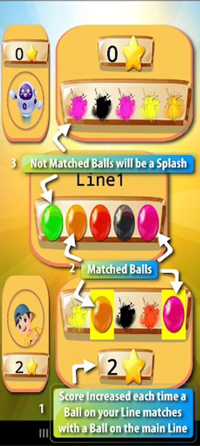 When the game starts there will be 3 main lines of hidden balls, each line has 5 balls and you will have your own line to guess which colors each ball has in the same order as the main line, if you hit 1 colored ball you will get 1 point but if it's a black ball, you'll earn 15 points, which means winning the game immediately without going through other lines. But pay attention, the black ball only appears one time in one of the lines, if you see it once you don't need to guess it for the next lines. Remembering that you will play against a robot that can beat you, so try to guess correctly. Good luck!