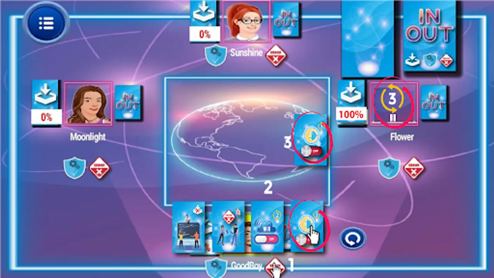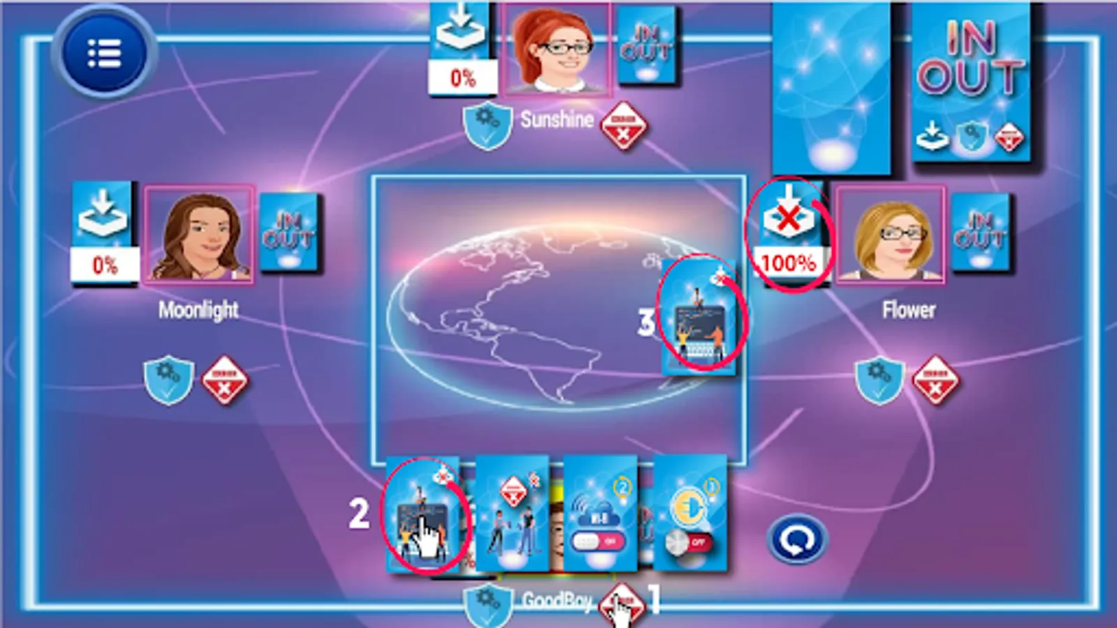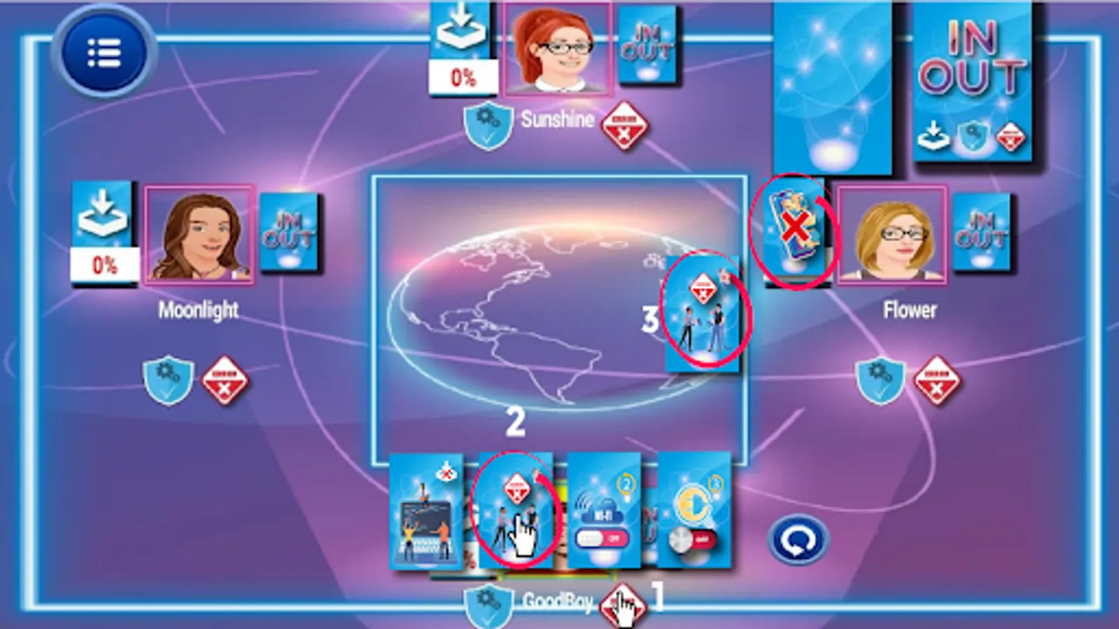 It is a game where players are connected to a simulated virtual network of the internet, each of them can have Advantage Cards and Error Cards. With Error Cards a Player can disrupt the opponent's system, and with Advantage Cards he can defend against errors. Each Player can download a simulated App, and with this App he can have the most wanted Cards, which are the InOut Cards where the OUT Card eliminates the opponent, and the IN Card that keeps him in the game. And we can't forget the Lucky Call that offers to you InOut Cards. Good luck!