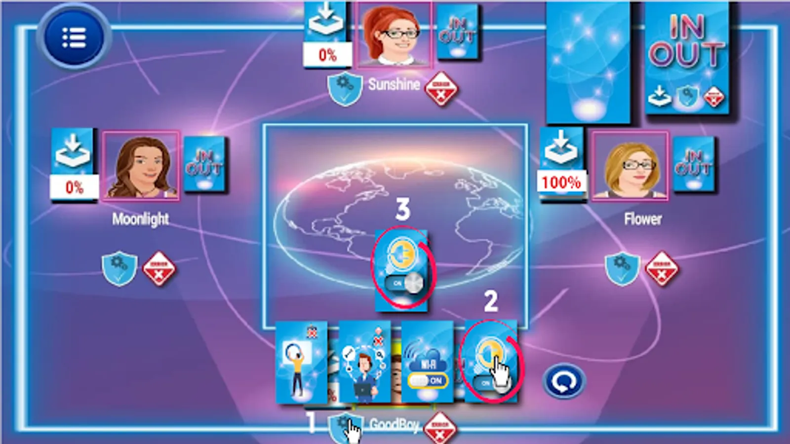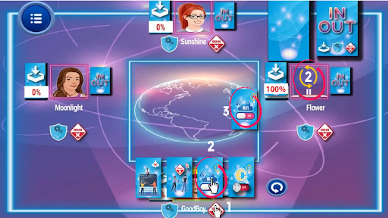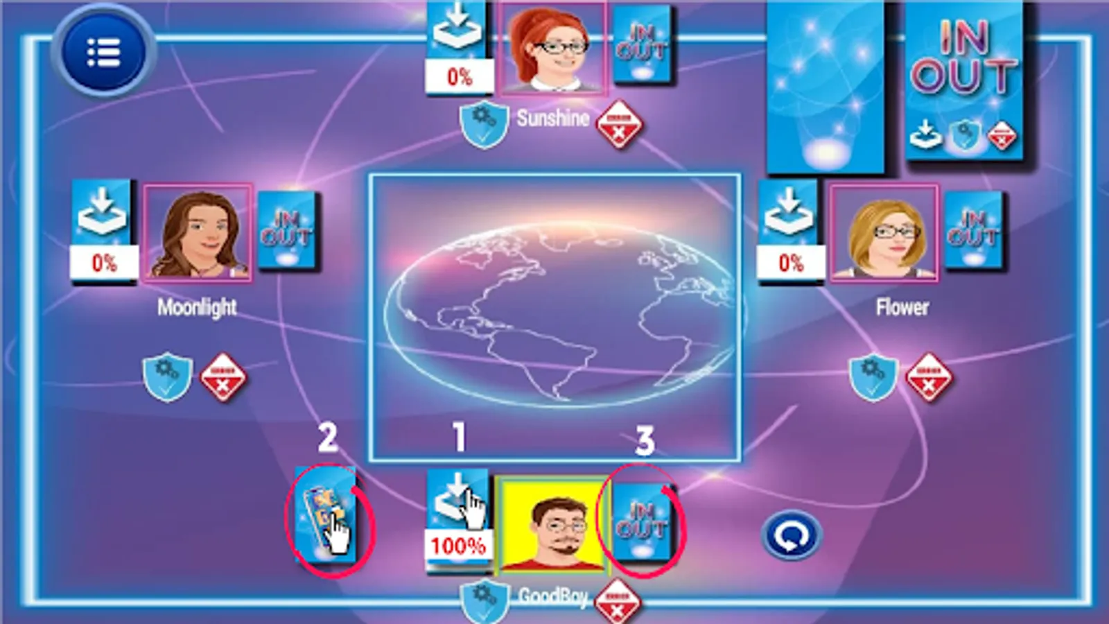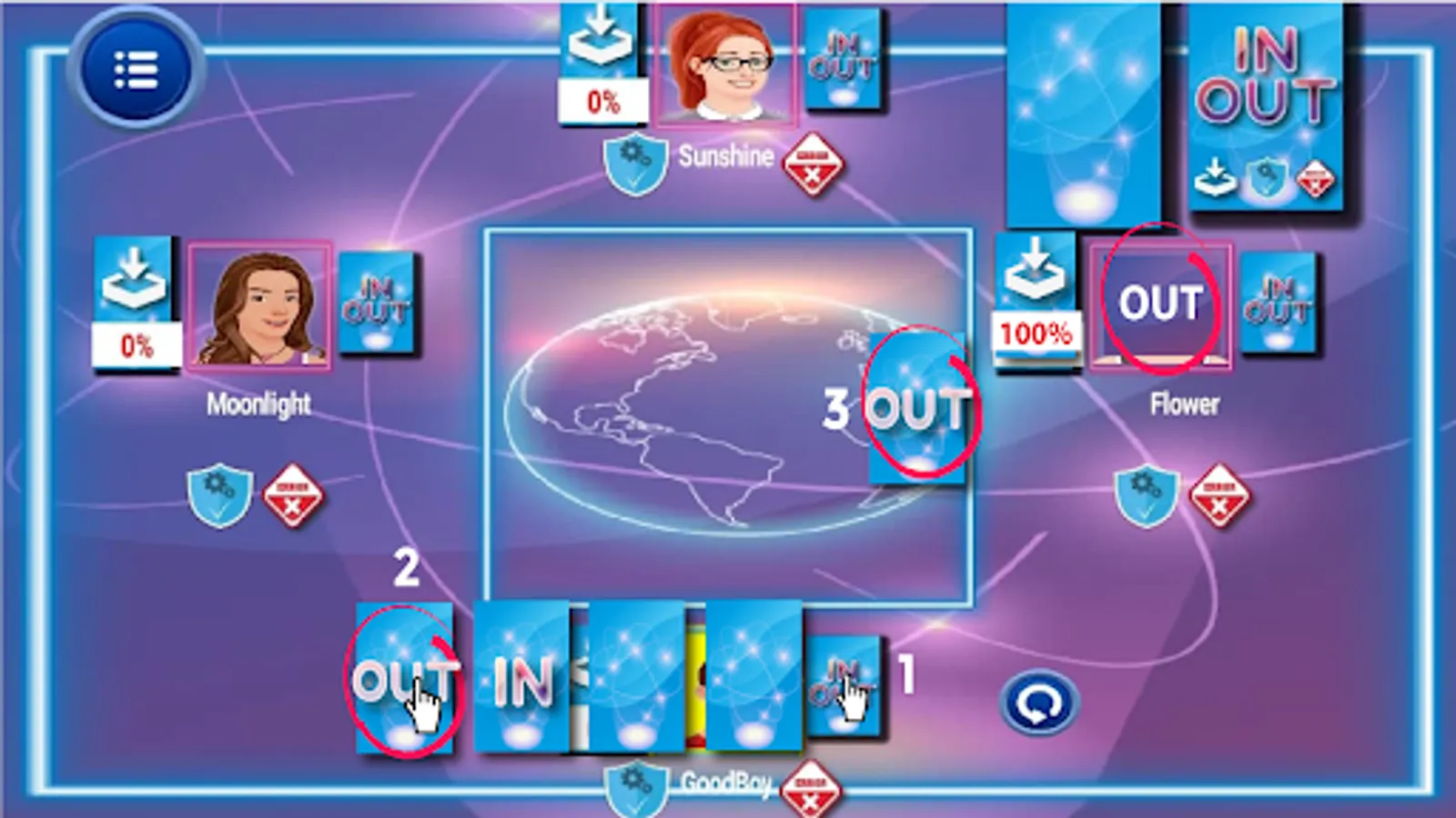 It is a game where players are connected to a simulated virtual network of the internet, each of them can have Advantage Cards and Error Cards. With Error Cards a Player can disrupt the opponent's system, and with Advantage Cards he can defend against errors. Each Player can download a simulated App, and with this App he can have the most wanted Cards, which are the InOut Cards where the OUT Card eliminates the opponent, and the IN Card that keeps him in the game. And we can't forget the Lucky Call that offers to you InOut Cards. Good luck!