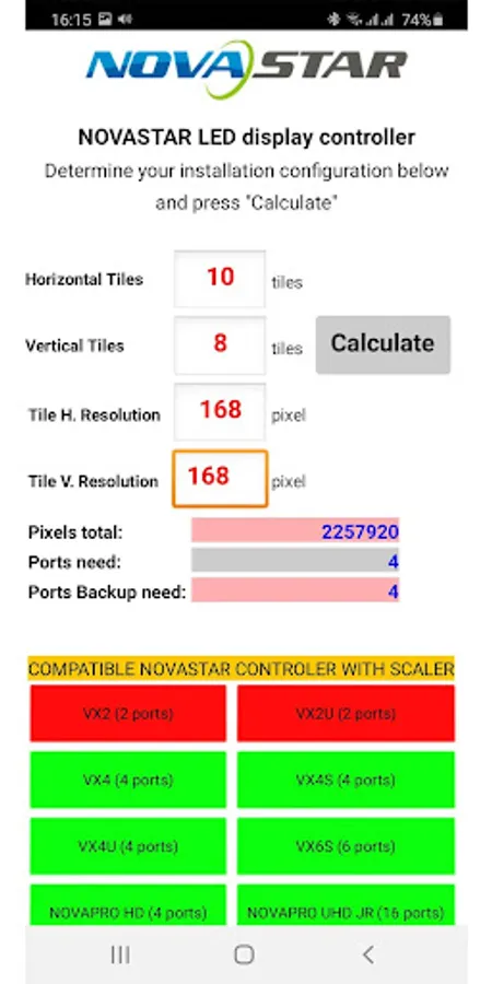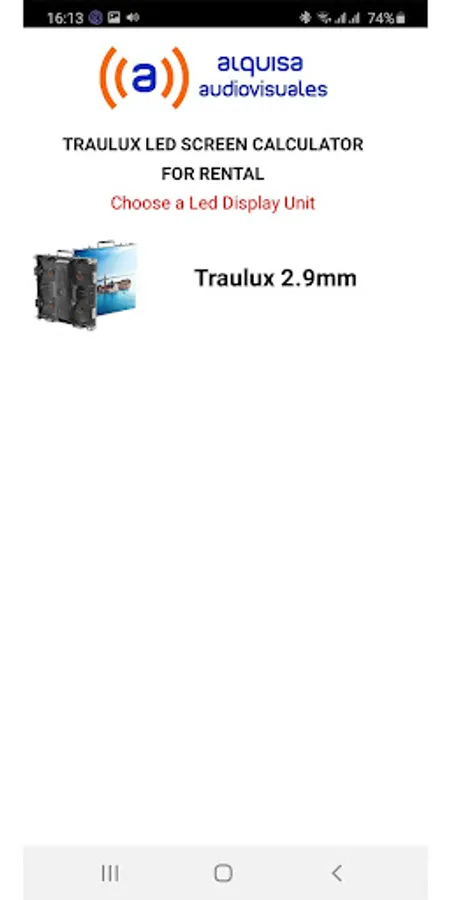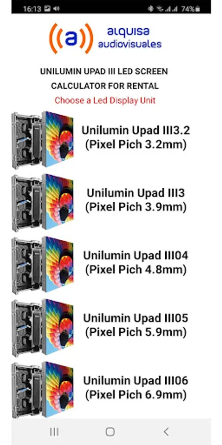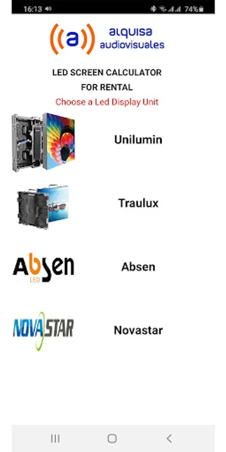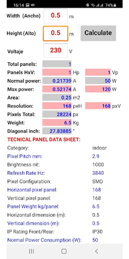 With this application you can quickly and easily obtain the most common calculations for the fixed or rental installation of various brands of led panels (weights, pixels, tiles, necessary electronics ...)