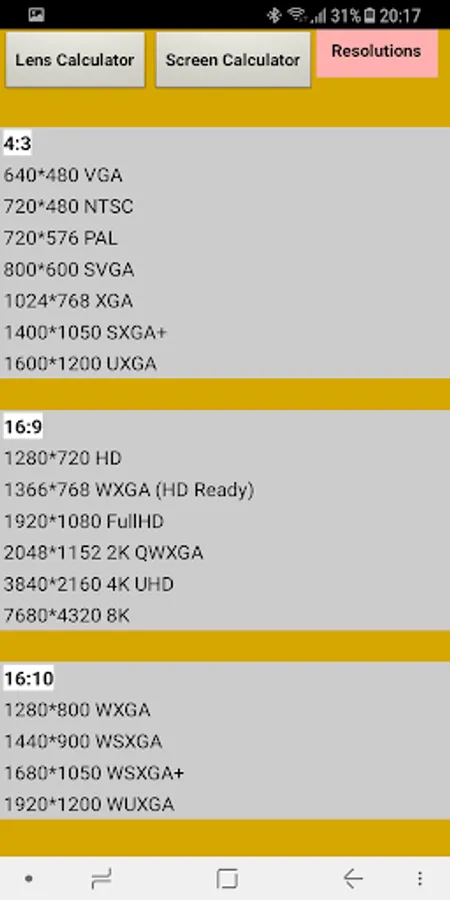 Quickly and easily calculate the various parameters to install a projector such as the distance between the projector and the screen, the lens ratio, the screen size and the resolution.