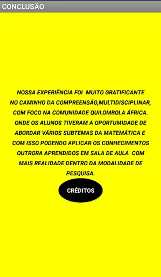 WE HAVE THIS APPLICATION IN CONSISTENCY WITH THE PLAY STORE PLATFORM THROUGH THE COMMENTS, TRANSFORMS THE GOOGLE SPACE IN A ROOM OF INTERACTION BETWEEN THE TECHNOLOGICAL PRODUCTION AND THE PEDAGOGICAL PRODUCTION DEVELOPED ON THE BLACK AWARENESS THEME IN MULTIDISCIPLINARY FORMAT, IN THE OTON GOMES DE LIMA SCHOOL, LOCATED IN THE MUNICIPALITY OF MOJU, IN THE STATE OF PARÁ, BRAZIL.