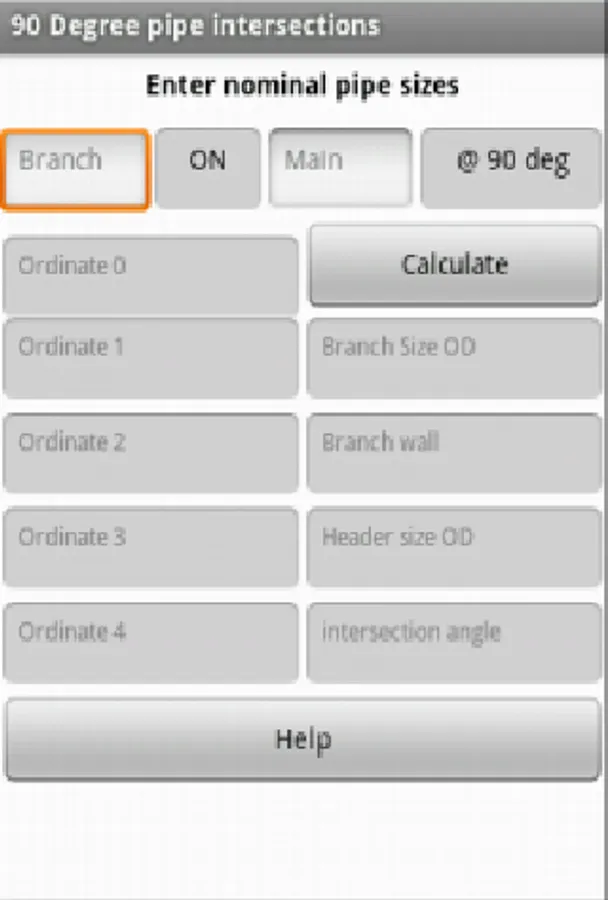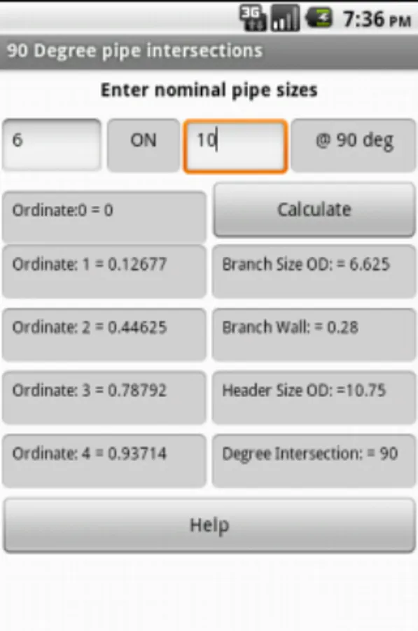 Tired of carrying the Franklin book or 1000 Piping intersections, then this app for 90 degree pipe intersections, or fish mouth is the answer. For Standard Weight pipe sizes ½” thru 24” simply enter the branch line in the first box and the main line in the second box and press calculate.The results are the ordinates (See Fig 20) for 16 points to lay out a 90 degree intersection. This app assumes you’re a journeyman pipefitter (steamfitter) and know how to layout the pipe when the calculated ordinates are given. If not see our webpage http://watersmechanical.com/appsforpipefitting.html for more info. Look for our upcoming app that allows for more pipe sizes and varying lateral degrees.