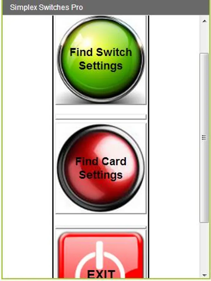 This app will find your switch settings for Simplex brand devices. In this PRO version, you are able to choose DEVICE switch settings or CARD switch settings...they are not the same (yea, you already know that)