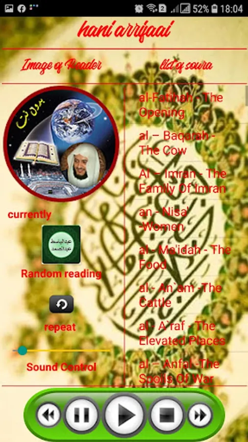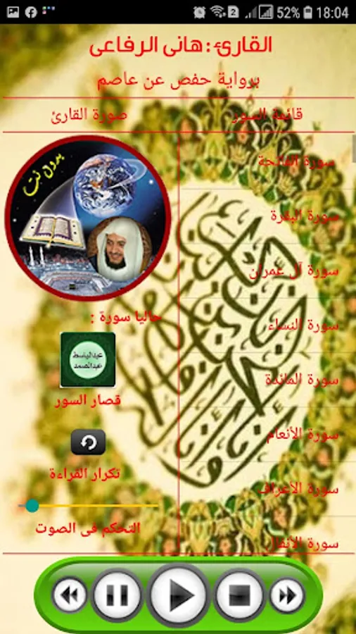 This application is a recitation of the book of God the wise voice of the reader Hani Rifai Brulee Hafs from Asim and benefit us God and you to listen to him The application contains the entire wall of the Koran contains: