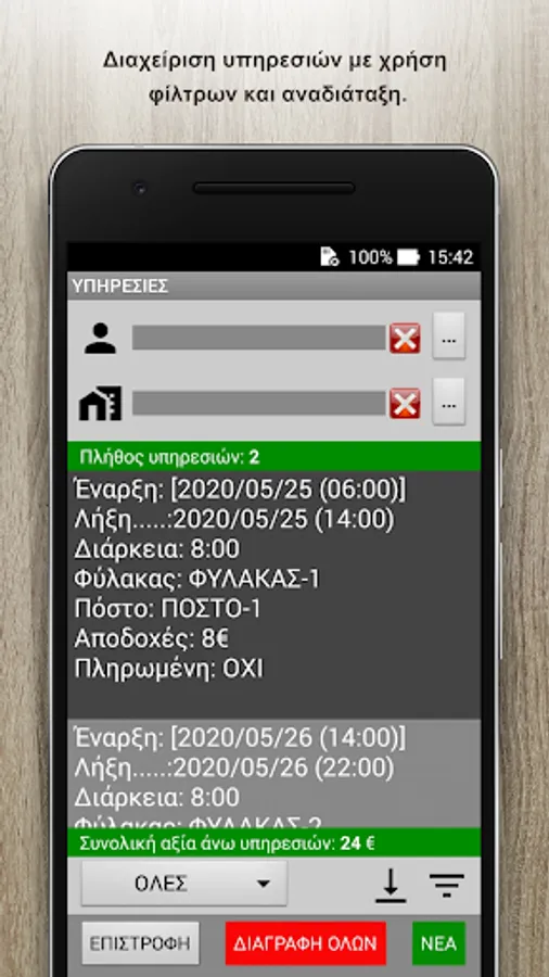 Simple application of recording of services (shifts), multiple employees, with sets of hours, services and their salaries. With various search and rearrangement filters, as well as the ability to notify people at the start and end.