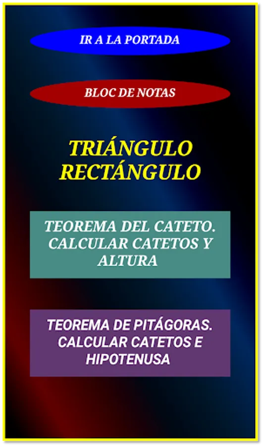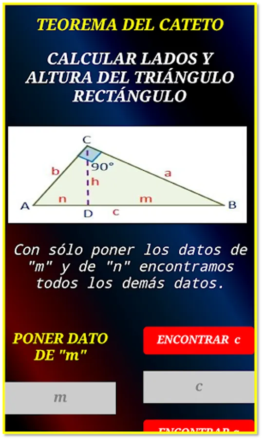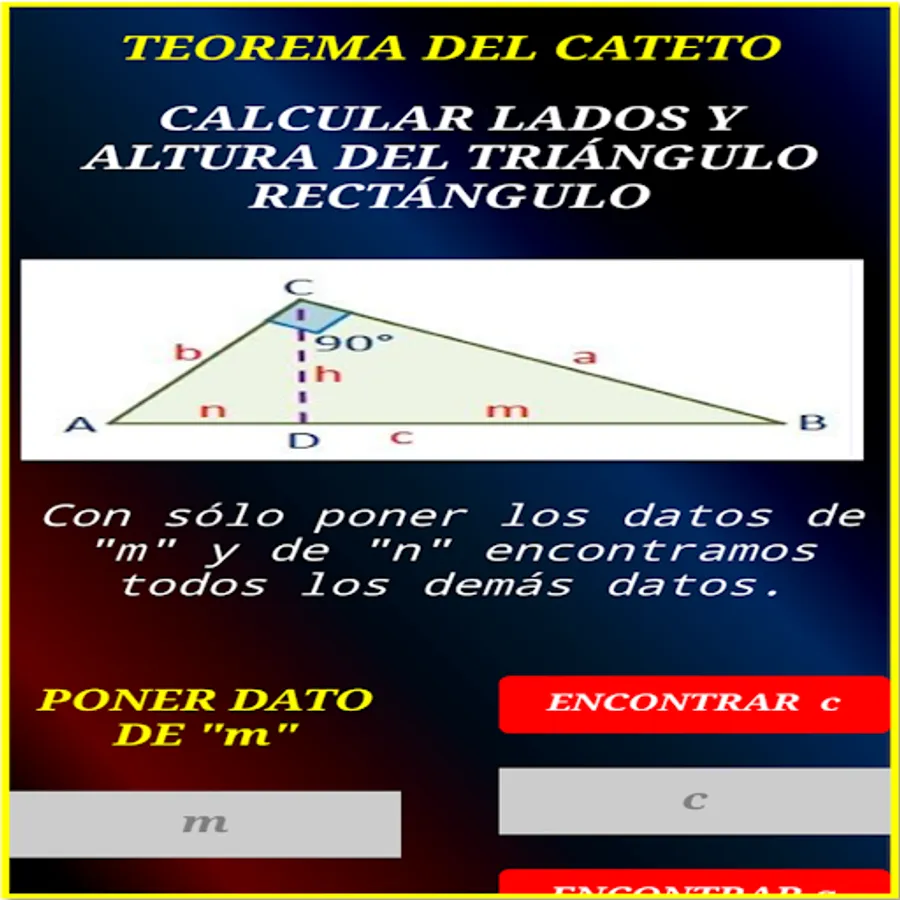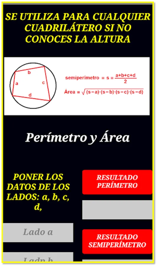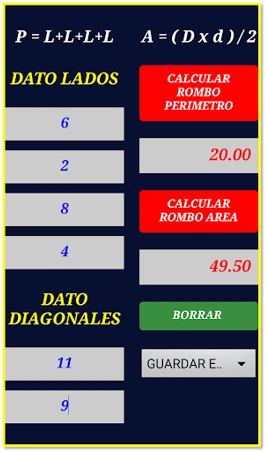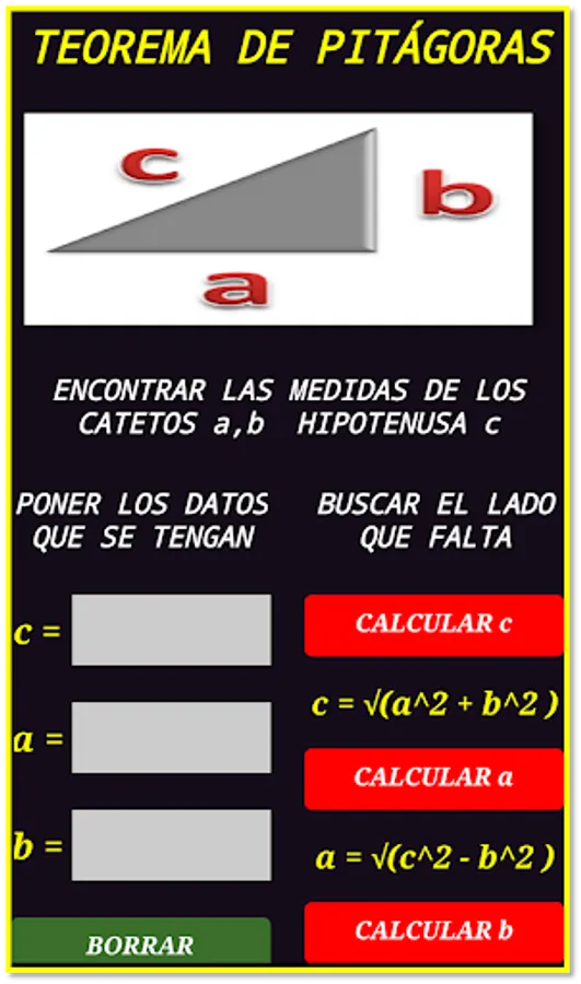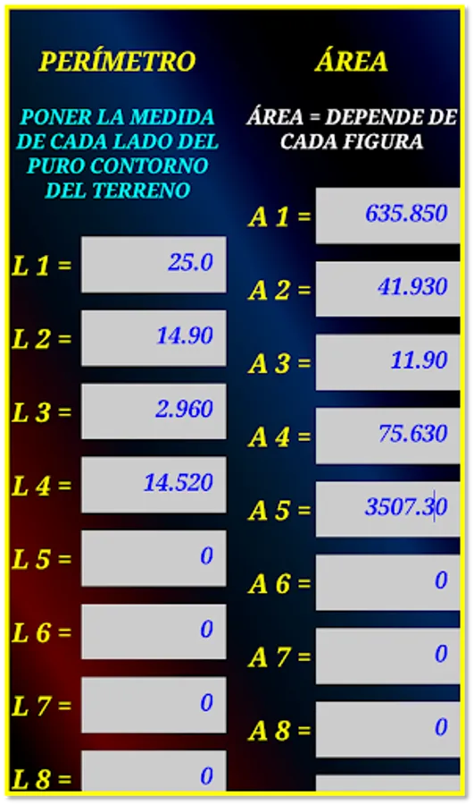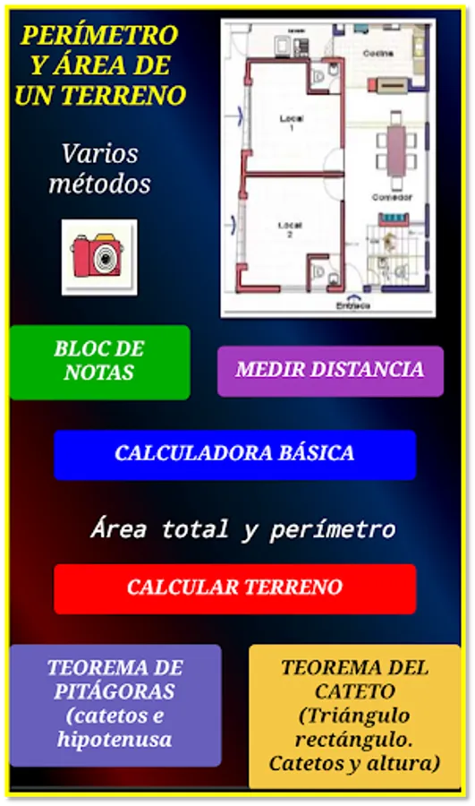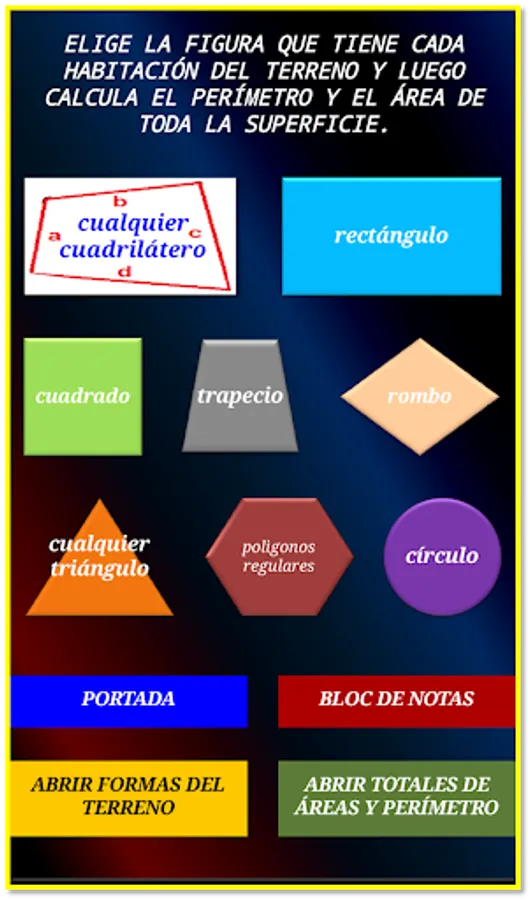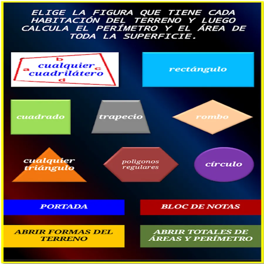 IT CONTAINS VARIOUS CALCULATORS THAT HELP YOU OBTAIN THE AREA OR PERIMETER OF LAND OR FLAT SURFACES, EITHER REGULAR OR IRREGULAR, USING REGULAR AND IRREGULAR GEOMETRIC FIGURES, IT ALSO HAS A BASIC CALCULATOR, ONE FOR THE CATETUS THEOREM AND ANOTHER FOR THE PYTHAGORAM THEOREM. YOU ONLY HAVE TO PUT THE INFORMATION OF THE MEASUREMENTS REQUESTED IN EACH GEOMETRIC FIGURE AND CLICK THE RED BUTTON TO OBTAIN THE RESULT.