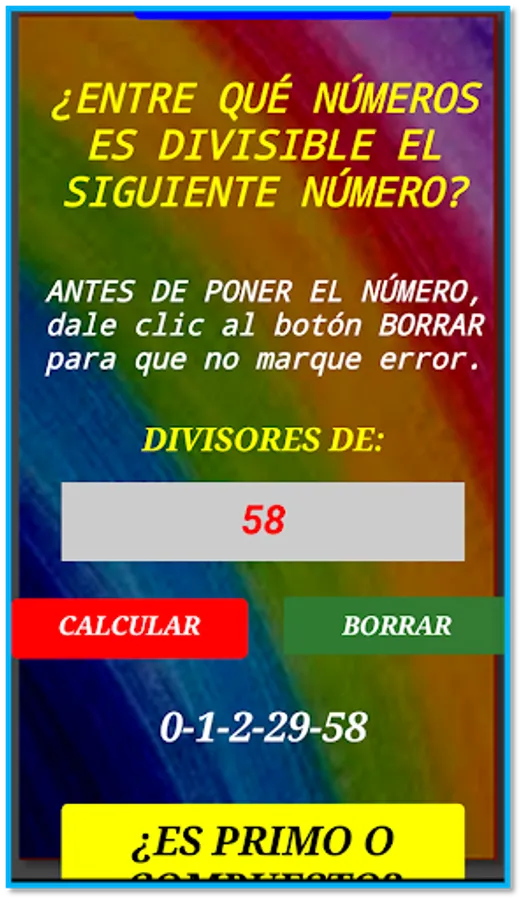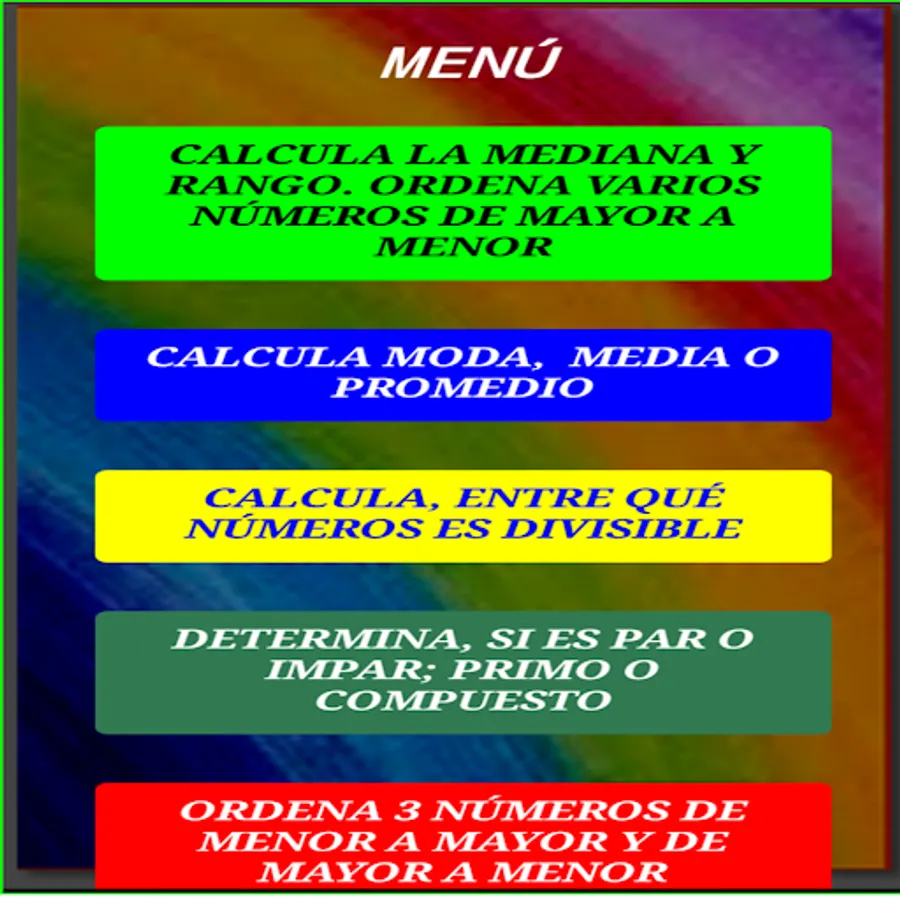 It is a calculator that helps to obtain the MEAN or AVERAGE, MEDIAN, RANGE AND MODE of a set of perfectly ordered data. It also calculates: PRIME, COMPOSITE, EVEN AND ODD numbers AND GIVES THE DIVIDERS OF ANY AMOUNT.