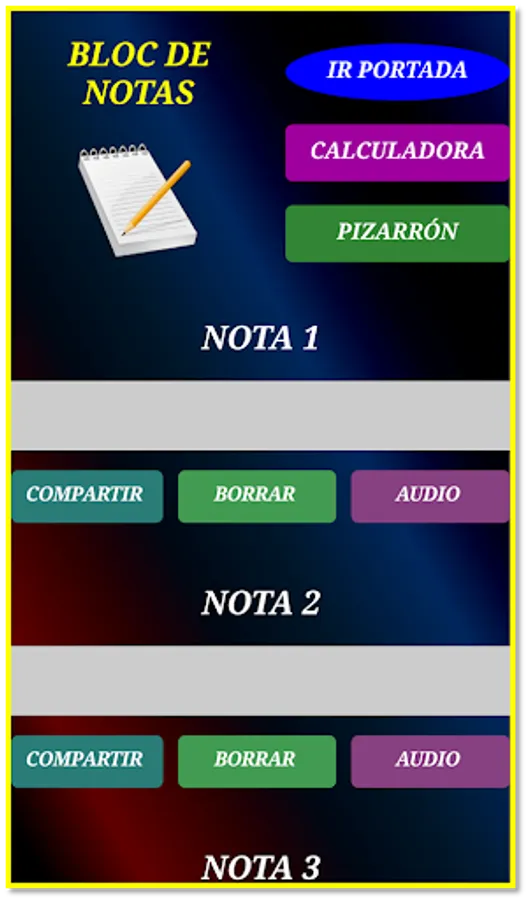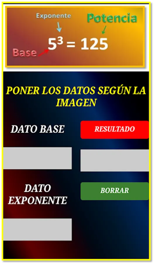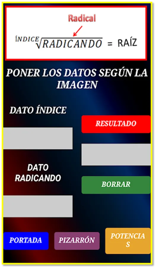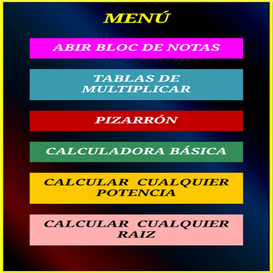 IT CONTAINS MULTIPLYING TABLES FROM 1 TO 10 IN SPANISH AND ENGLISH (AUDIO), WHICH ARE APPEARING INDIVIDUALLY ACCORDING TO CHOOSING, A BASIC CALCULATOR, POWER AND ROOT CALCULATOR AND ALSO A BLACKBOARD AND NOTEPAD.