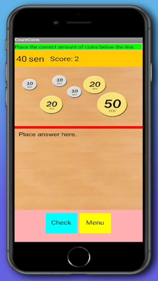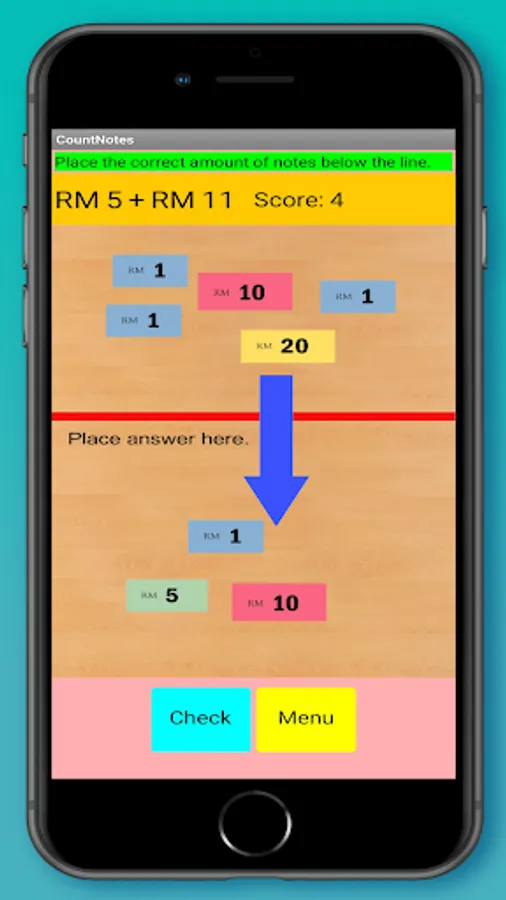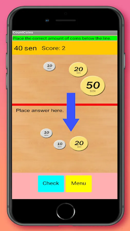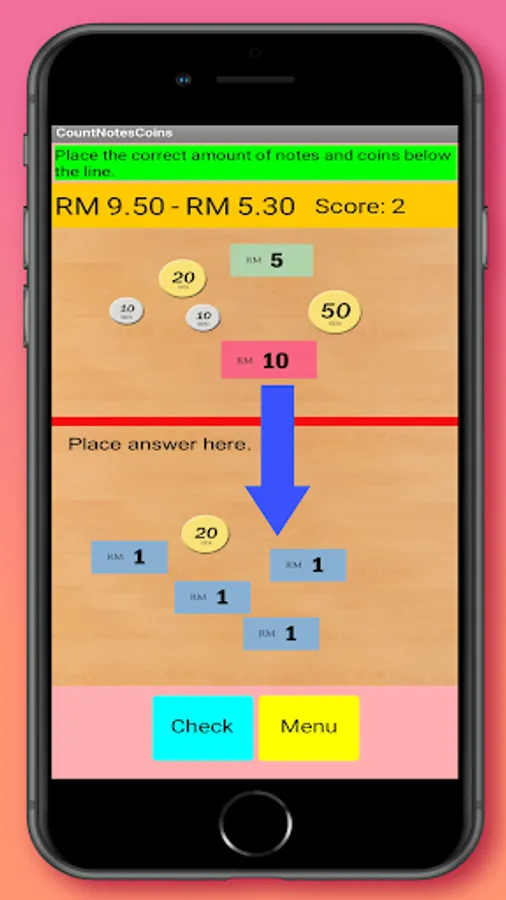 The amount to be counted is indicated at the top of the screen. All that is required is to drag the amount of money indicated to the area below the red line. Then press the check button. If the amount of money is correct, a clapping sound will be heard and the score will increase by one.