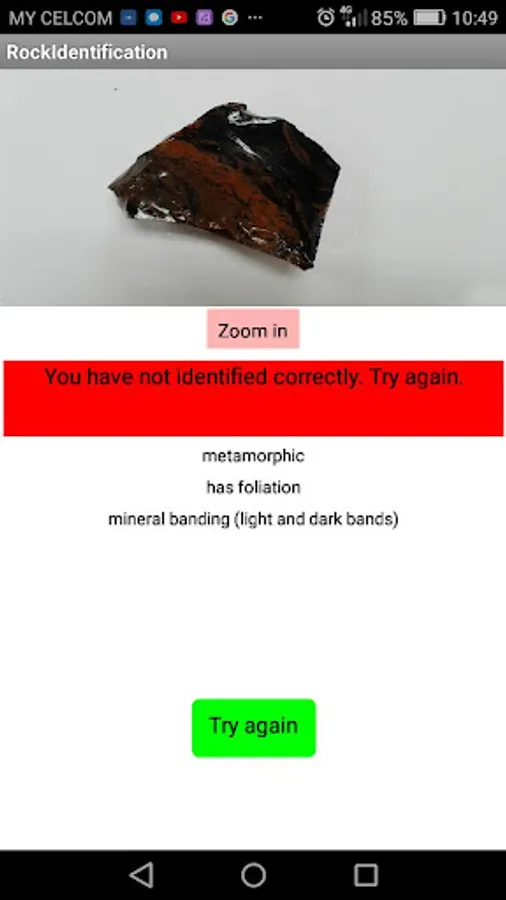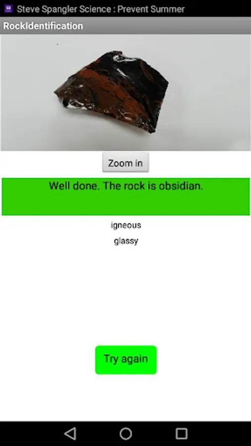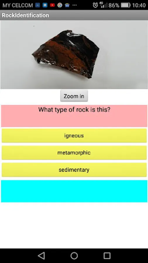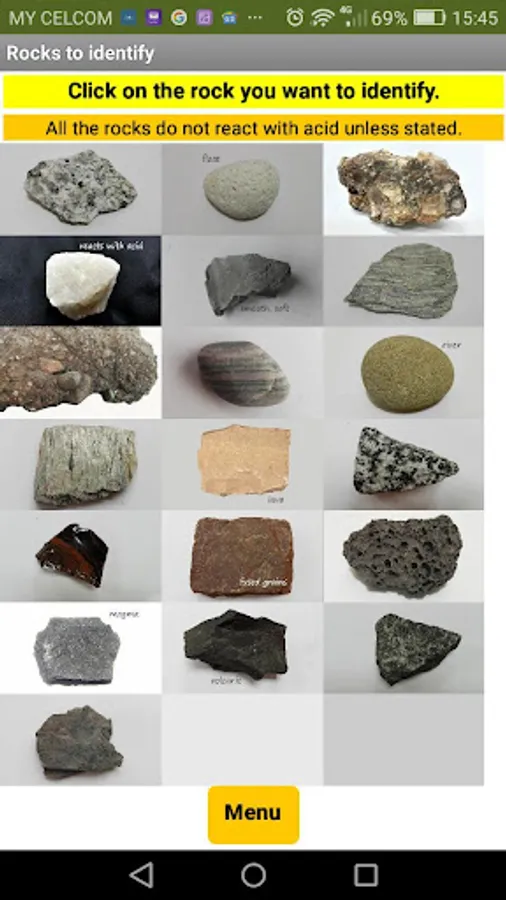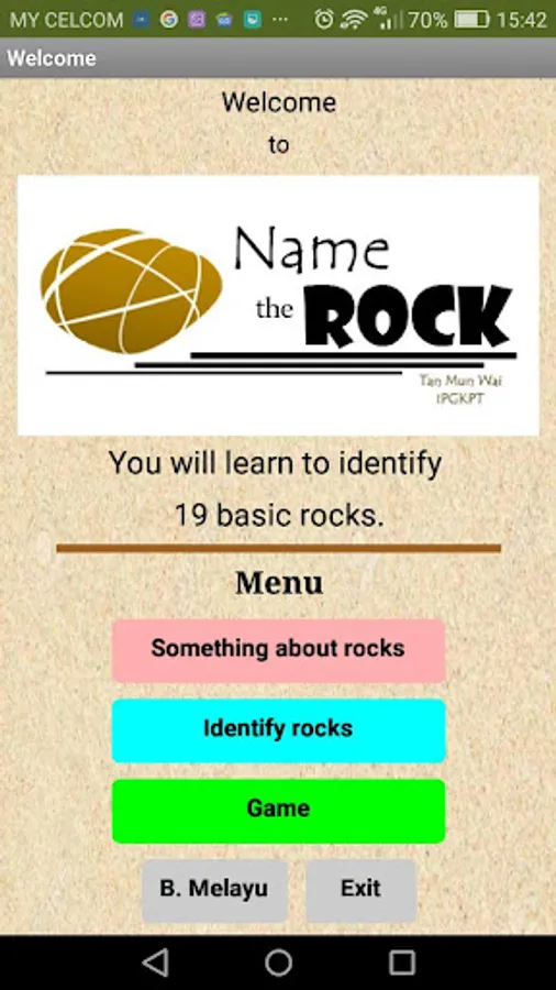 This app has three sections; Something about Rocks, Identify Rocks and Game.