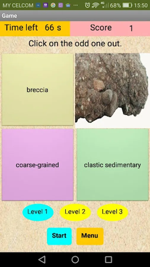 In this timed game, you choose the odd one out from a set of descriptions and image of a rock. When the choice is correct, the score increases by 1. The challenge is to choose as many correct odd ones out before the time runs out.