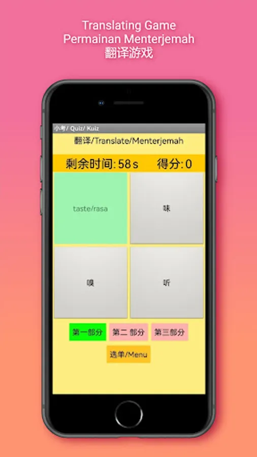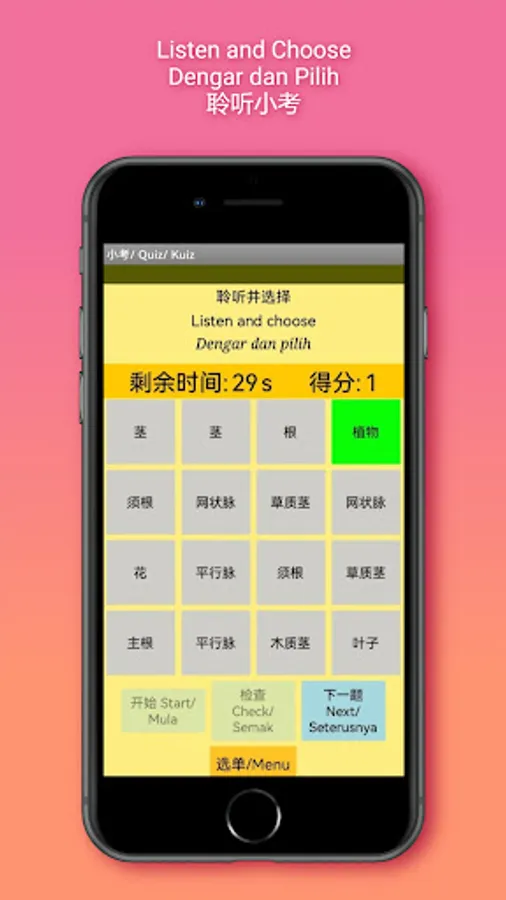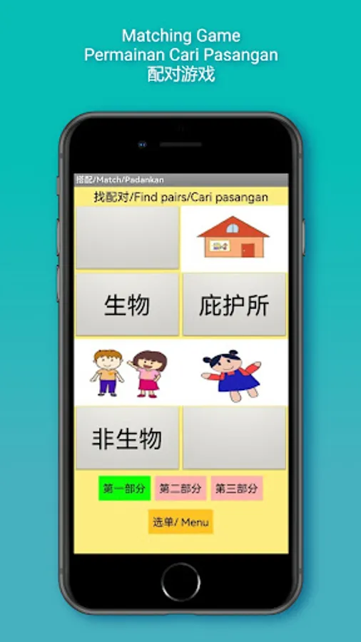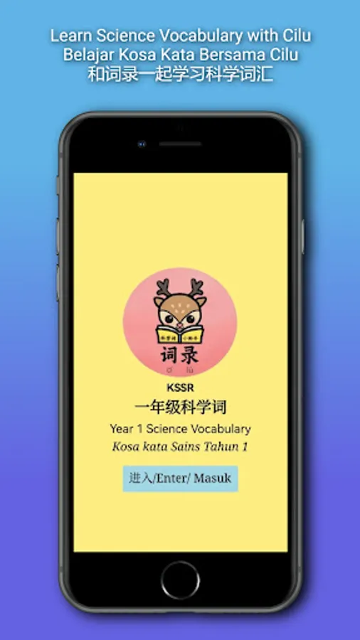 The app contains 70 basic science vocabulary, divided into three sections. Section 1 contains topics 1, 3 and 4; Section 2; topics 5 and 6 and Section 3; topics 7&8, 9 and 10 of the KSSR Science Year 1 curriculum in Chinese.