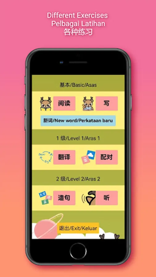 For reading, pupils learn to read a new word by hearing the pronunciation and understand the meaning and usage of the word through animated gif, sentences related to the word, and translations into English and Malay.