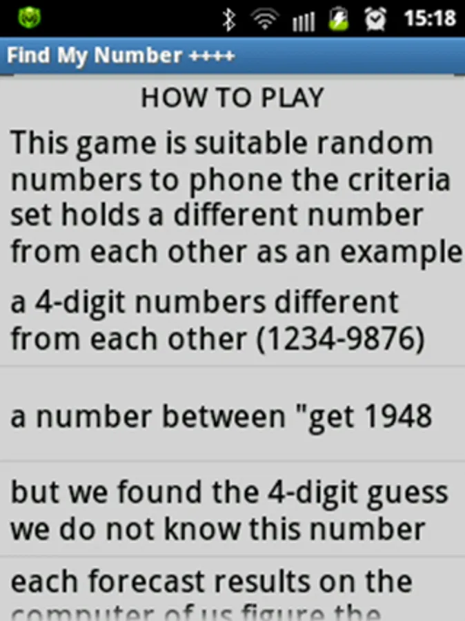 This game is suitable random numbers to phone the criteria set holds a different number from each other as an example, a 4-digit numbers different from each other (1234-9876), a number between "get 1948, but we found the 4-digit guess we do not know this number, each forecast results on the computer of us figure the location at the right place +; In different places - gives the hint, held a number of figures or nothing Estimated number of our summer,