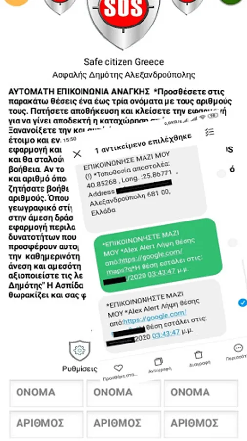 We add the phone numbers of people we trust from our phone contact list. When we need help, we press the top center button with the shield and the red circle. That's enough to get instant shipping working.