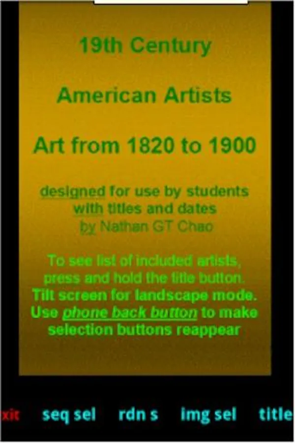 This app displays the important artworks created by American artists in the 19th century. It includes works from mid 1820s to just before 1910.