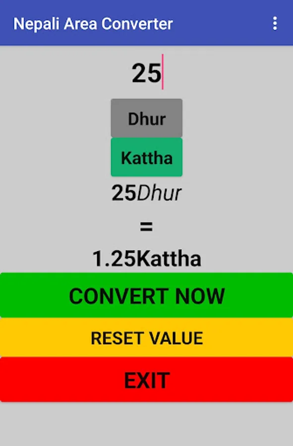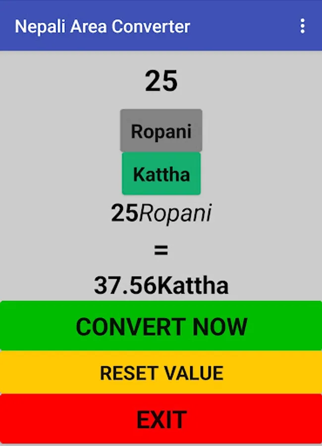 Area measurement system used for land in Terai regions is completely different from hilly regions. Katha, Bigha and dhur systems are mainly used in Terai region. In other hand, Ropani, aana, daam and paisa systems are used in mountainous regions. Unit supported are Bigha, Kathha, Dhur, Ropani, Aana, Paisa, Daam, Square Foot, Metre Square.