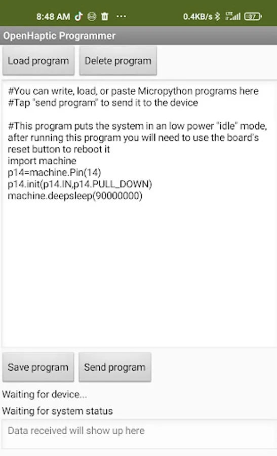 This app is used to communicate with and program your OpenHaptic device. For more information about Openhaptic, see https://github.com/nathanww/OpenHaptic