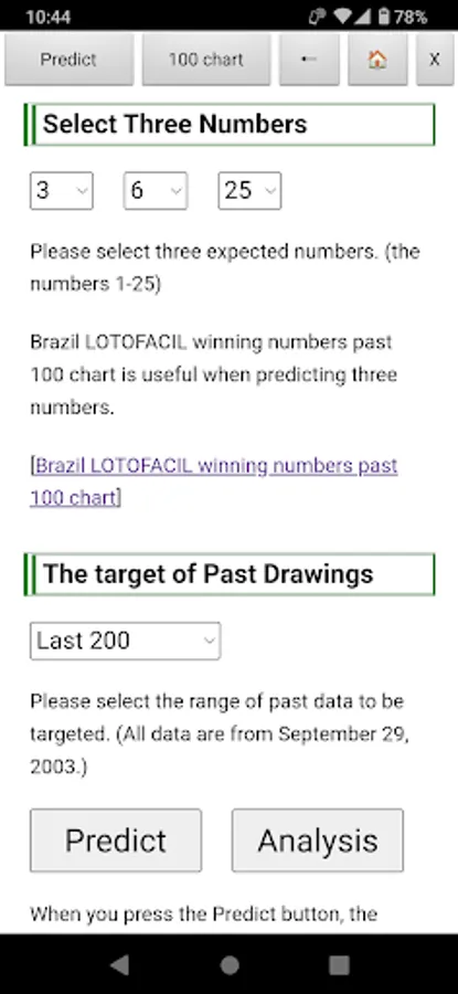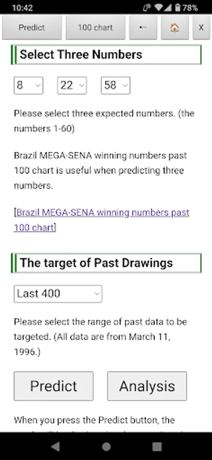 This software is not a perfect prediction software because you have to predict the one or two or three numbers yourself using "Brazil MEGA-SENA, QUINA, TIMEMANIA, DIA DE SORTE, DUPLA SENA, LOTOMANIA, LOTOFACIL, +Milionaria and Super Sete winning numbers past 100 chart".