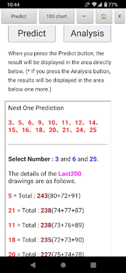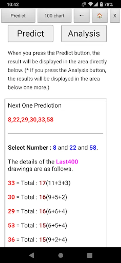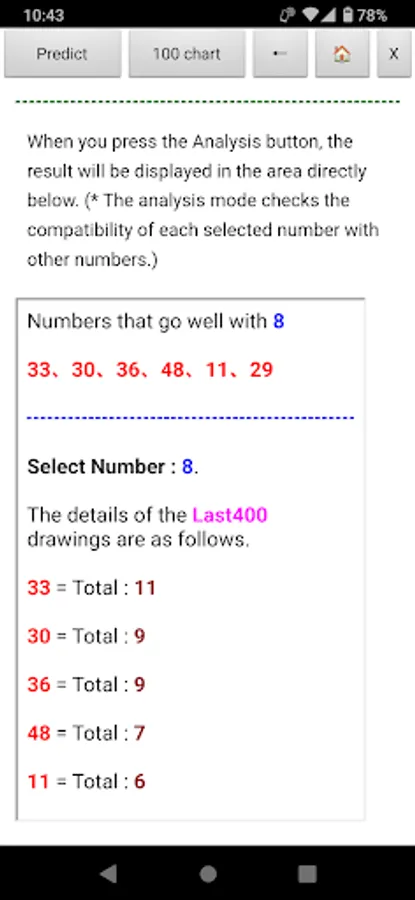 When you click the analysis button, you can check the compatibility of each selected number with other numbers with the same settings as when making a prediction.