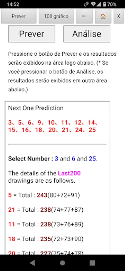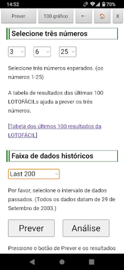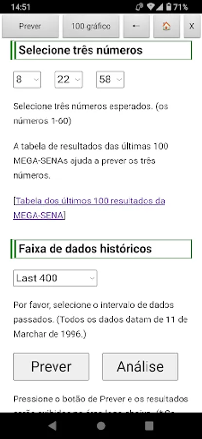 This software is not a perfect prediction software because you have to predict the two or three numbers yourself using "Brasil MEGA-SENA, QUINA, TIMEMANIA, DIA DE LUCKY, DUPLA SENA, LOTOMANIA, LOTOFÁCIL, +Millionária and Super Sete past winning numbers 100 chart".