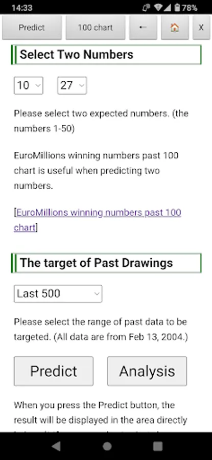 This software is not a perfect prediction software because you have to predict the two or three numbers yourself using the past 100 charts of EuroJackpot, EuroMillions, UK LOTTO, Set For Life, THUNDERBALL, Irish Lotto, Vikinglotto, German Lotto 6aus49, SuperEnalotto, El Gordo Sunday 5/54+1, Swiss Lotto and French Loto.