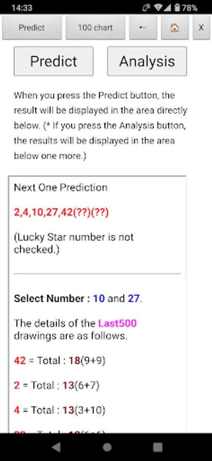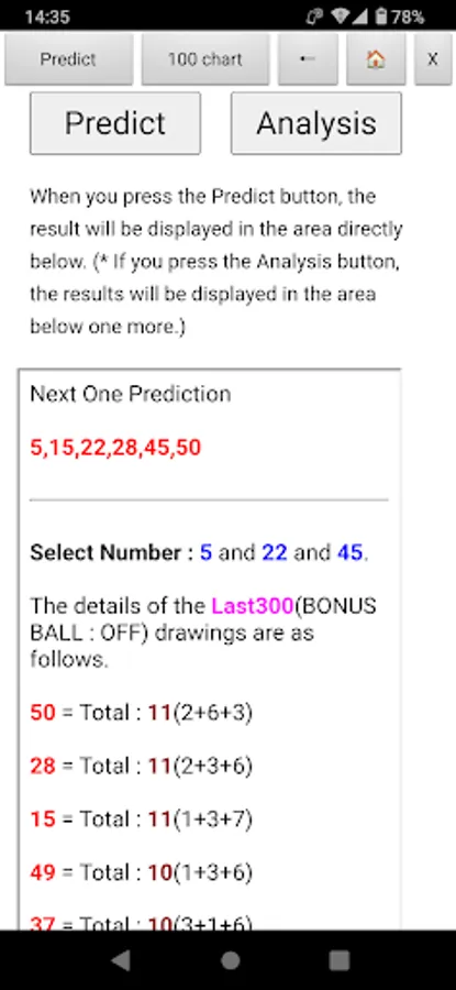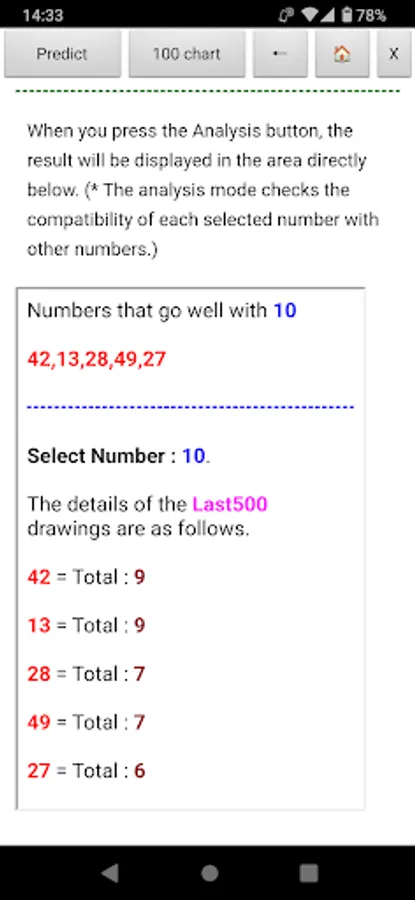 When you click the analysis button, you can check the compatibility of each selected number with other numbers with the same settings as when making a prediction.