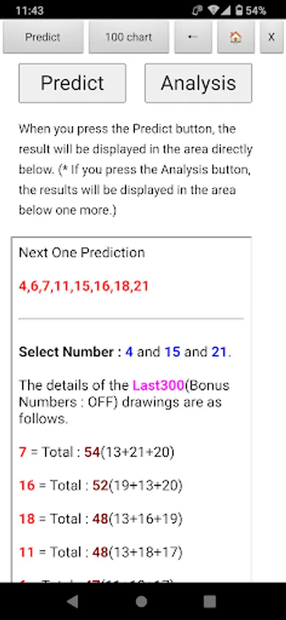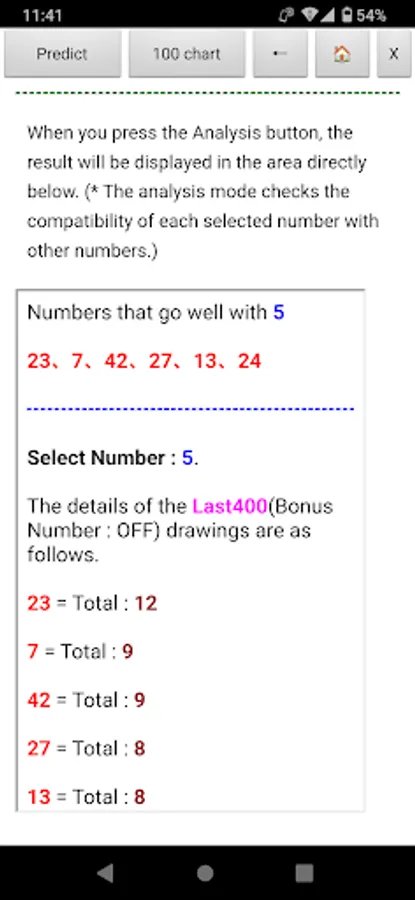 When you click the analysis button, you can check the compatibility of each selected number with other numbers with the same settings as when making a prediction.