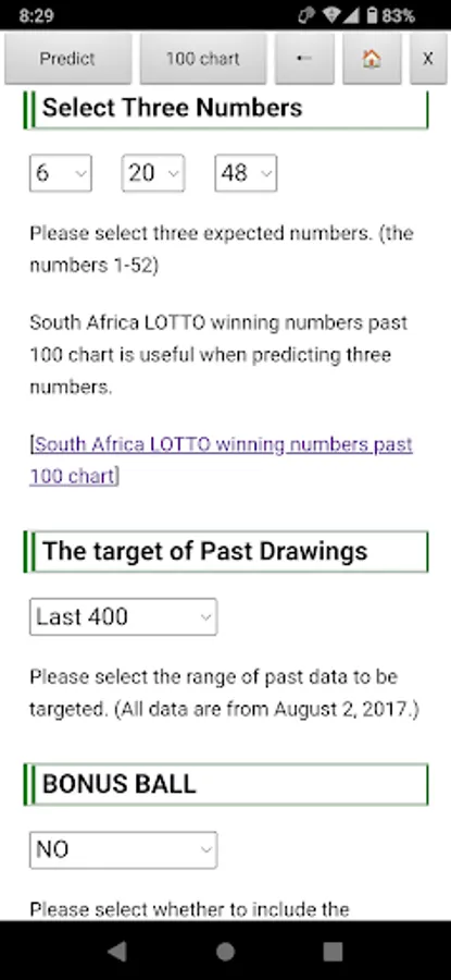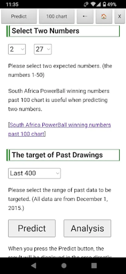 This software is not a perfect prediction software because you have to predict the two or three numbers yourself using "South Africa PowerBall winning numbers past 100 chart" or "South Africa LOTTO winning numbers past 100 chart" or "South Africa Daily LOTTO winning numbers past 100 chart".