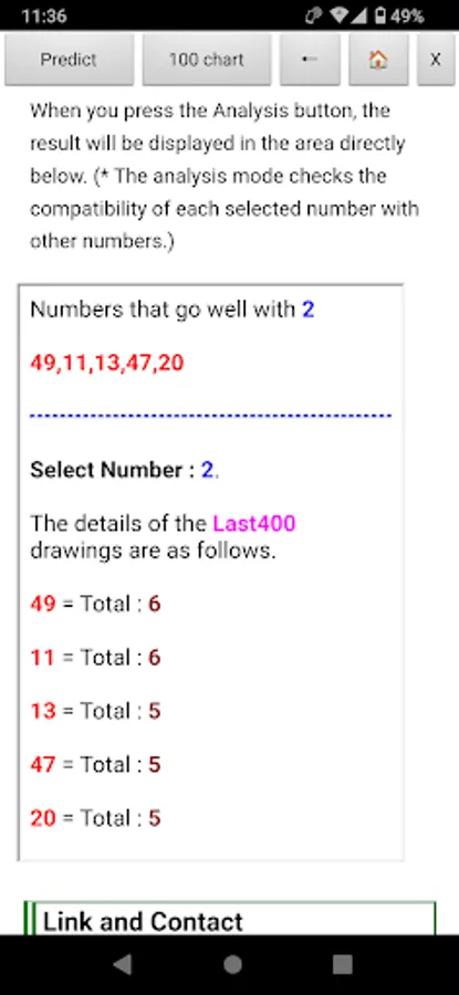 When you click the analysis button, you can check the compatibility of each selected number with other numbers with the same settings as when making a prediction.