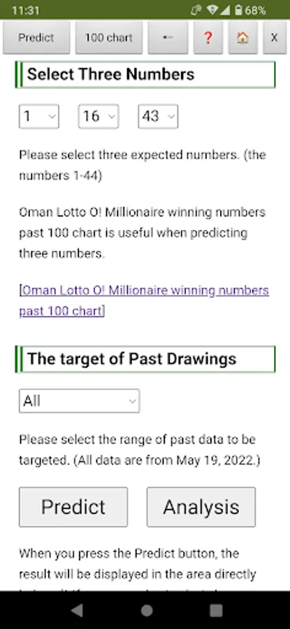 This software is not a perfect prediction software because you have to predict the three numbers yourself using "Oman Lotto O! Millionaire winning numbers past 100 chart".