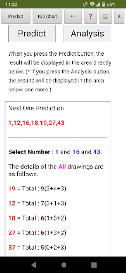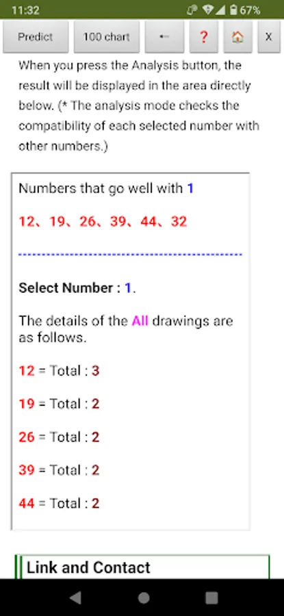 When you click the analysis button, you can check the compatibility of each selected number with other numbers with the same settings as when making a prediction.