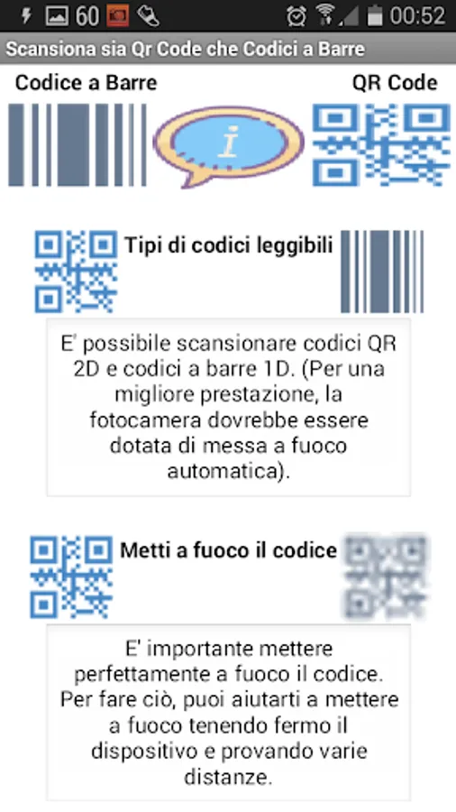 ●La connessione internet non è necessaria per scansionare i codici QR o a barre