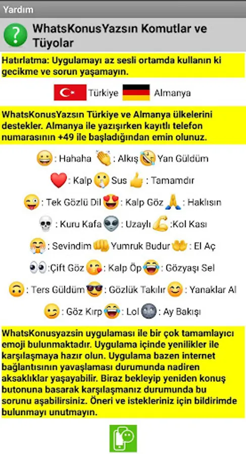 Do you want to be the fastest writer on Whatsapp? WhatsKonusyazsin application is for you! It translates your speech into writing instantly. It adds to the emoji if you command it. It makes it very easy for you to communicate with your friends or in fast business correspondence. You can correspond with all the comforts inside Turkey and Germany. You can access commands and useful information from the Help tab.