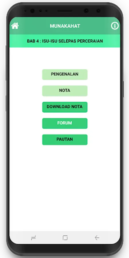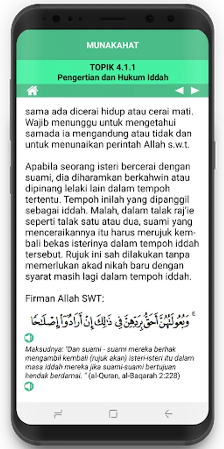 Islamic education is one of mandatory subjects for Community College students. To help students understand the four issues of Divorce Issues in Islam for the subject of MPU 1331 Islamic Education 2, Munakahat Apps have been developed with the aim of diversifying teaching and learning methods as well as facilitating students to access notes and training. This innovation was developed using Mit App Inventor software and can be used only for the Android platform. Students can easily access and download notes. This app turns out to be saving time, energy and resources as students can continue to access notes and training via smartphones and no longer require printed notes. In addition to the notes, the Qur'anic verses and Quranic texts are provided in the form of audio to facilitate students to learn the correct reading. Students can also test their minds by answering various quizzes online. There is also an overall summary note in the form of audio with the aim of enabling students to revisit this topic without limiting places and times at the same time making the application very flexible. This app also facilitates lecturers as this application provides suggestions for teaching that can be used as a reference. This app is designed for students who can use the general public at large. The application is also linked to forum space to enable students and the community to communicate and discuss issues of marriage. If users of Munakahat Apps need advice, this app provides links to make it easier for users to contact specific parties for reference.