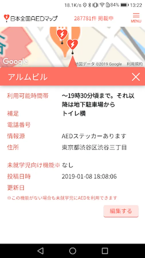 The AED posting data is supported by general posts. If you have found an unpublished AED or erroneous data, please tap the AED marker and correct it. (You can also edit it on PC.)