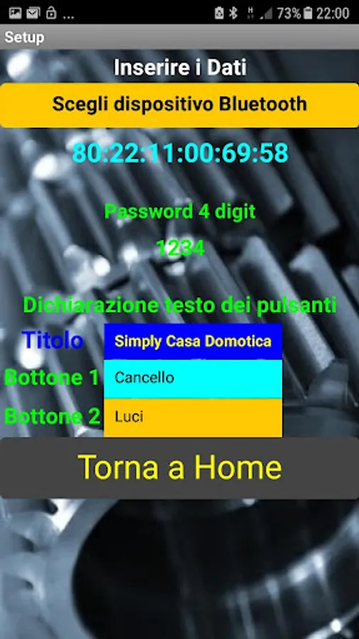 This APP allows you to transmit simple commands, via Bluetooth from your mobile phone, to a control unit designed to receive these data and process them so that your wired electrical system becomes flexible, wireless, turning it into a home automation.