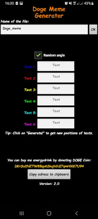 Enter custom texts and let the app work it's magic. The text position will be randomly generated. You can save the picture to your device or share it directly from the app with your friends. Easy, simple and fun to use.