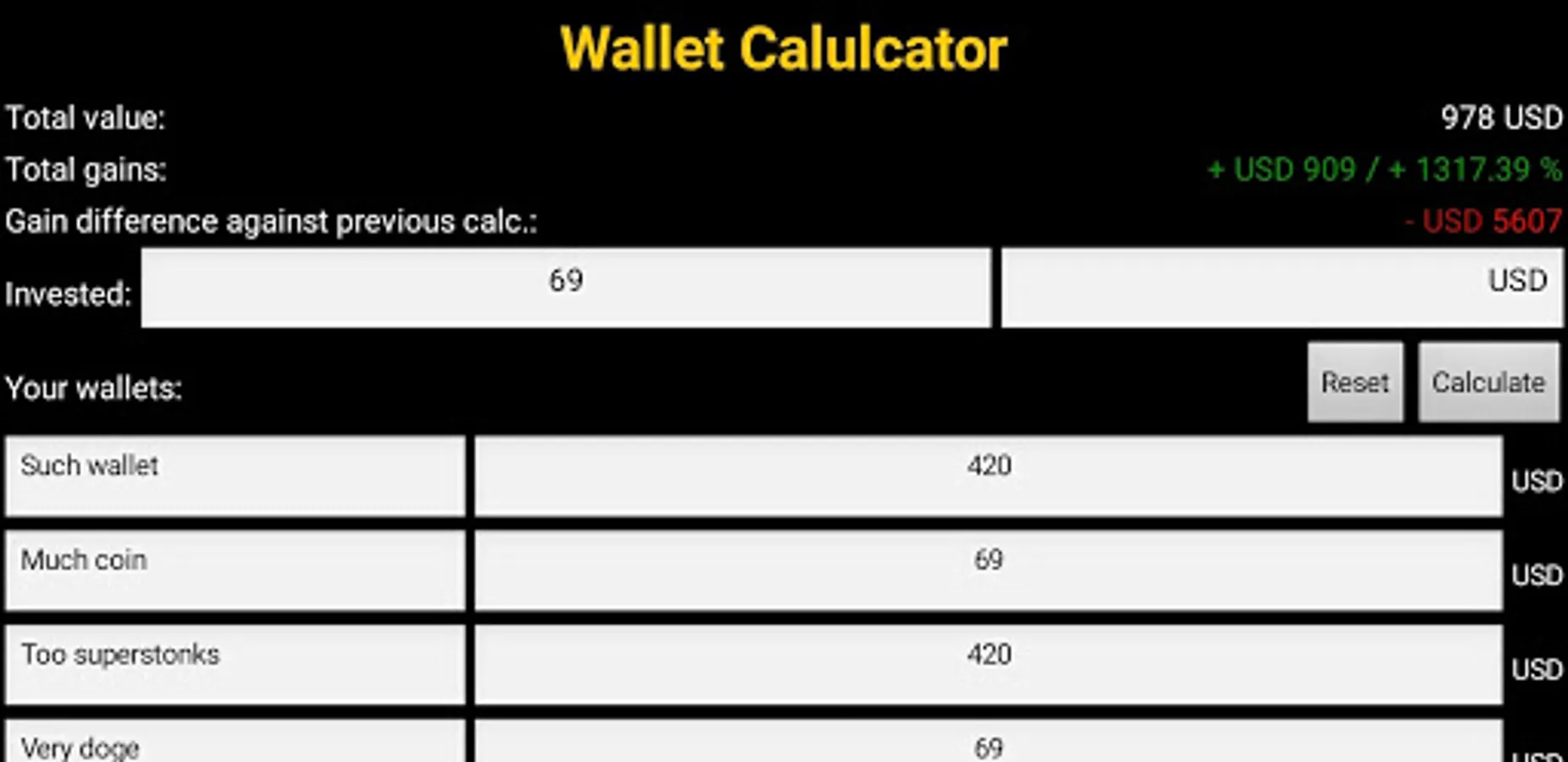 Simple app I made to track my gains on multiple wallets without ads. App remembers last calculation after closing. You can edit the currency, track up to 10 wallets / accounts and compare gain difference between calculations.