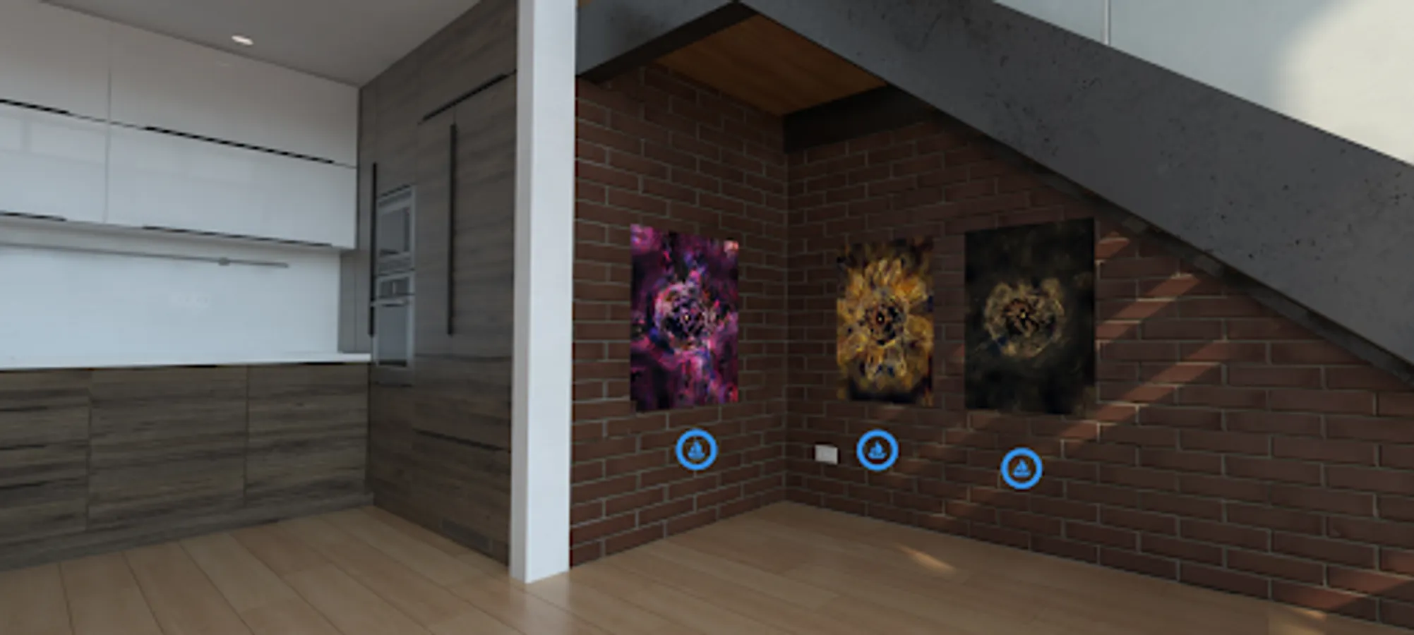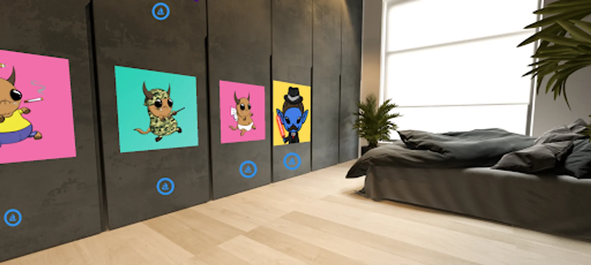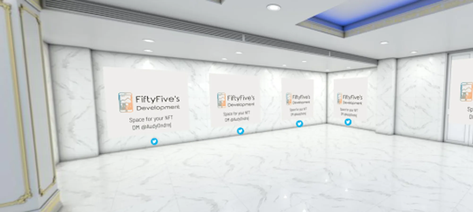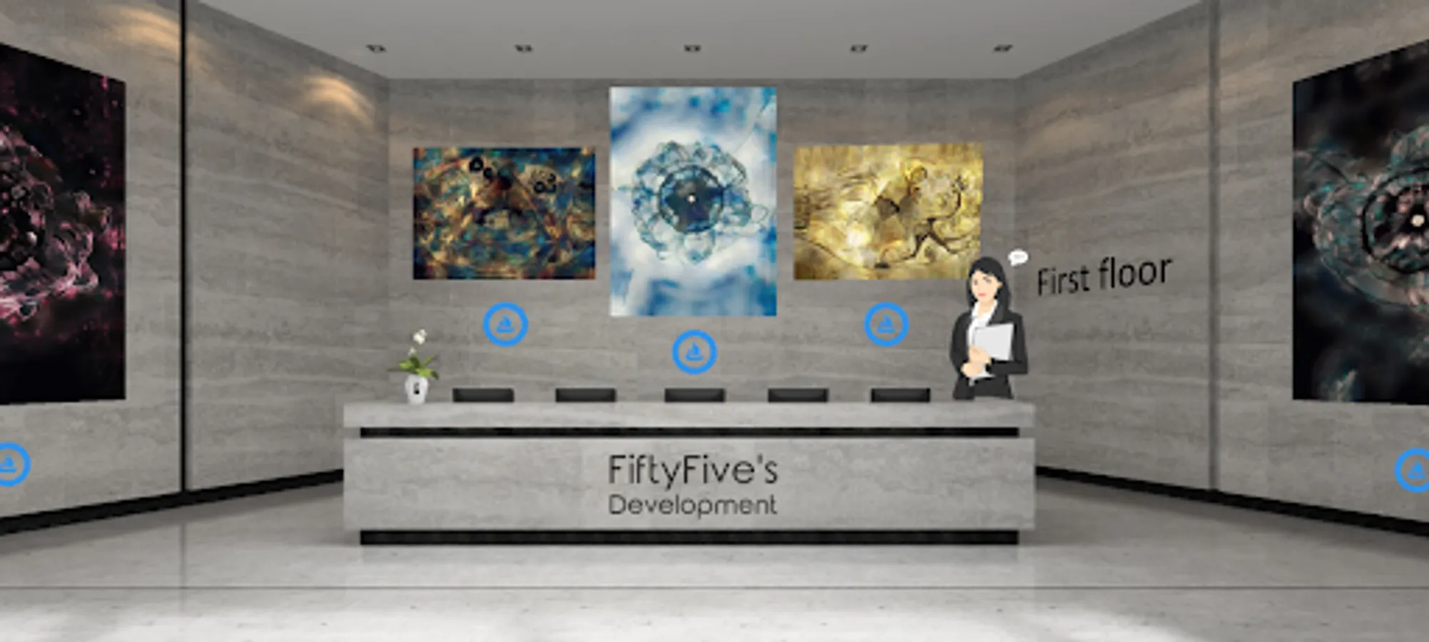 It's virtual gallery of NFTs created by FiftyFive's Development. You can see owner nametage of the art and look at Opensea listing of the NFT right from inside the app. There is integrated chat where you can say hi to other visitors.