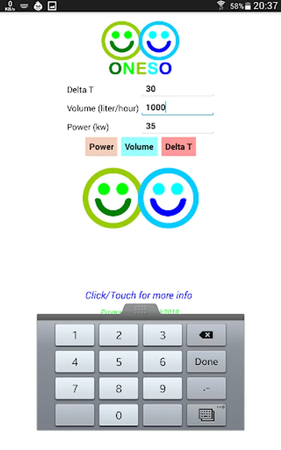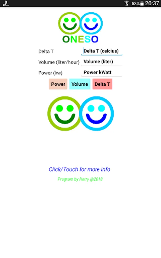 A small program to calculate the energy need to heat certain amount of water in one hour, there are 2 known paremeter and one to be calculate, for example volume and delta temperature known then calculate the power needed, power and delta temperature known then calculate the volume, power and volume known then calculate delta temperature. delta temperature means the difference of the temperature, work on range 1 to 99 degree celcius.