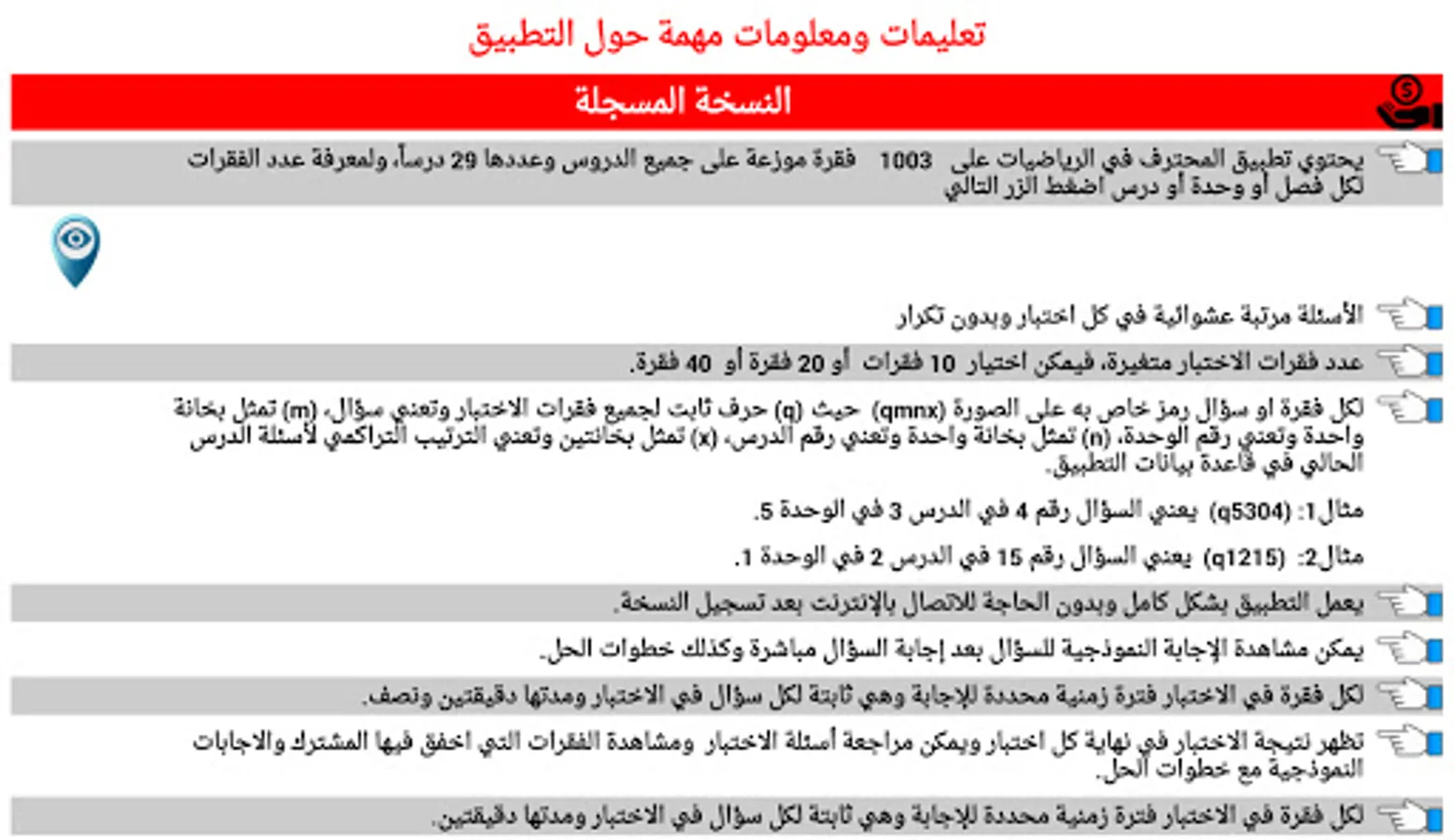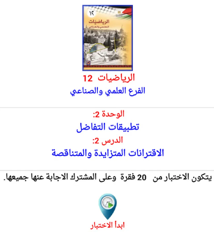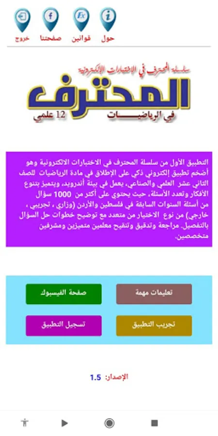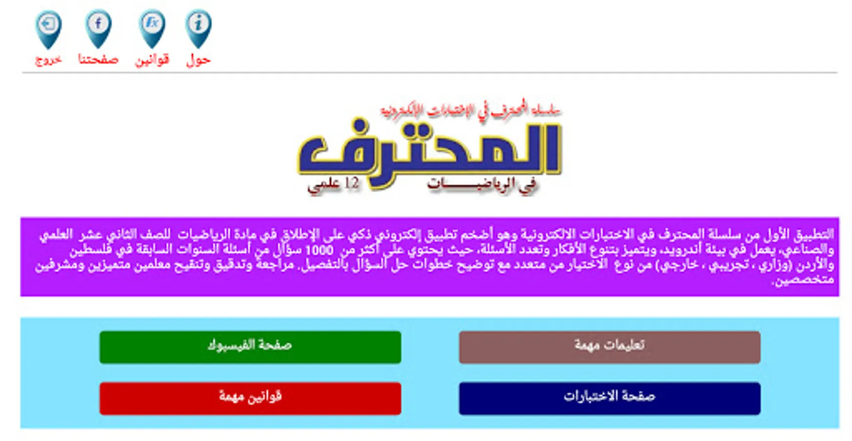 The professional in mathematics is the first application of the professional series in electronic tests, and it is considered the largest smart electronic application at all in the twelfth grade (tawjihi) scientific and industrial mathematics topic. The application works in the Android environment, and is characterized by the diversity of ideas and the multiplicity of questions. The application contains more than 1000 questions from the previous years' questions in Palestine and Jordan (ministerial, experimental, external) of the multiple choice type, with detailed steps to solve the question step by step. The contents have been reviewed, edited, and revised by distinguished teachers and dedicated moderators.